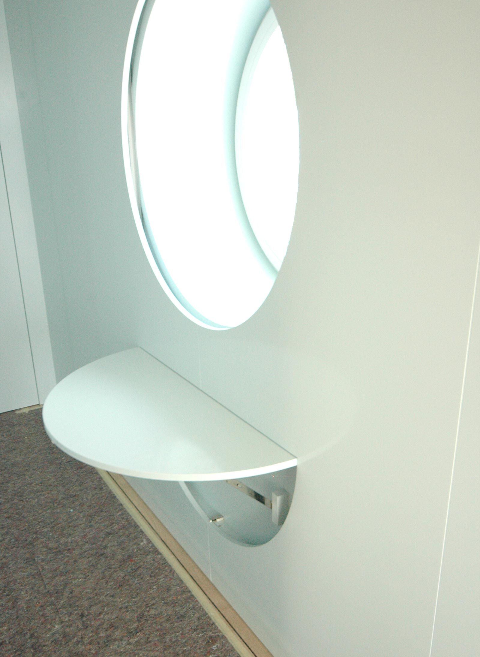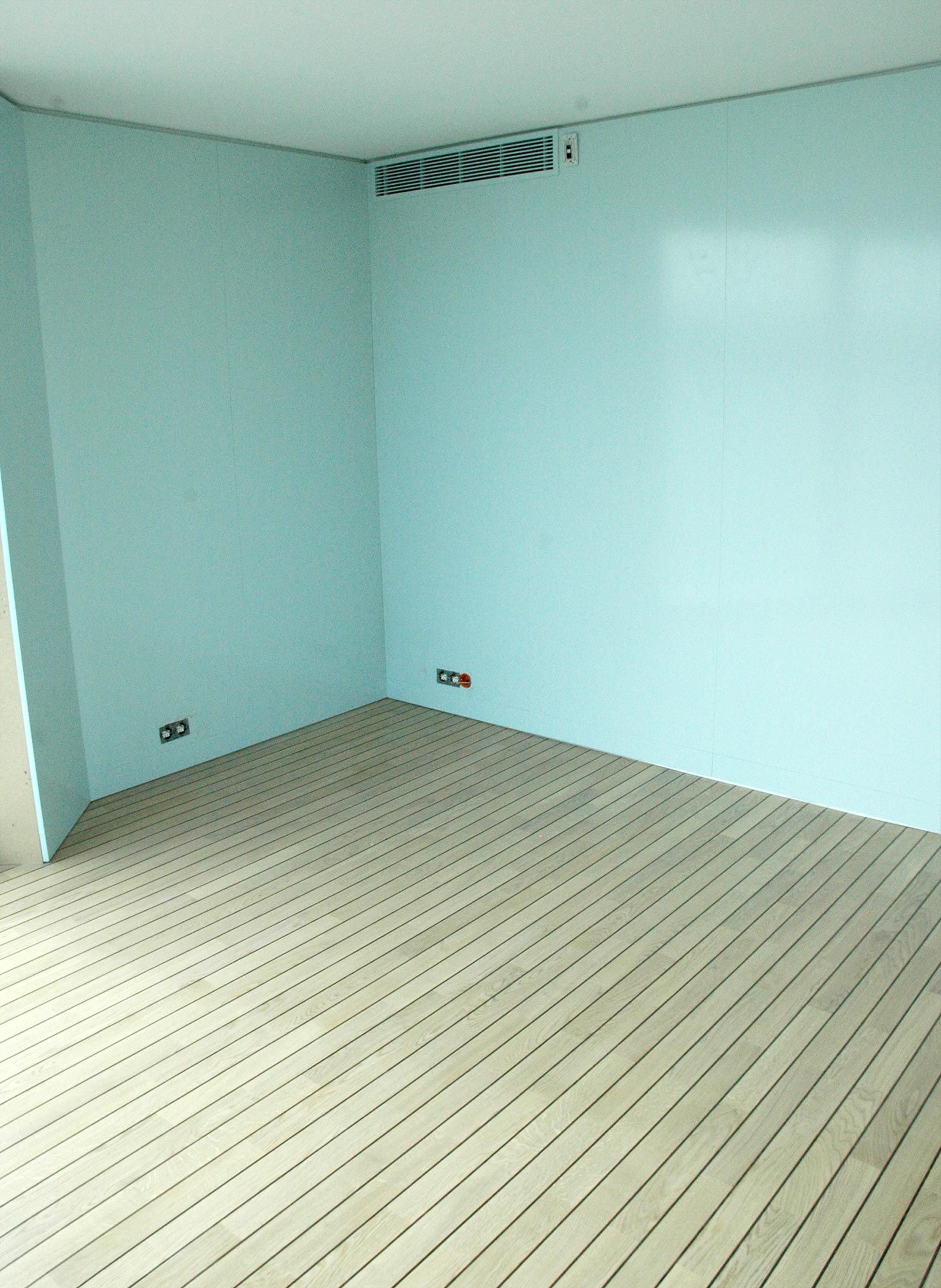 Für die Wandverkleidungen wurden färbige Schleiflackoberflächen mit hohem Glanzgrad verarbeitet. Die Optik des Boden im Innenbereiche mit Eiche und Wenge.