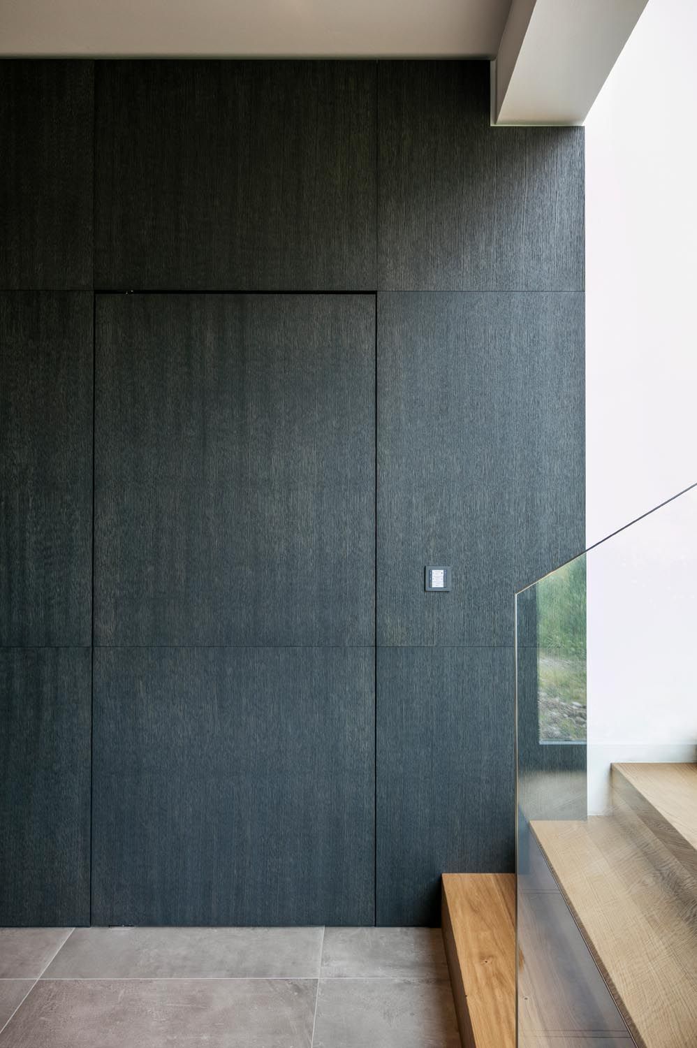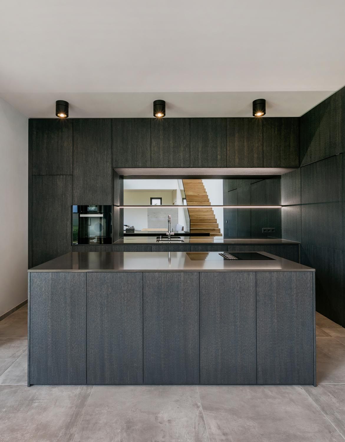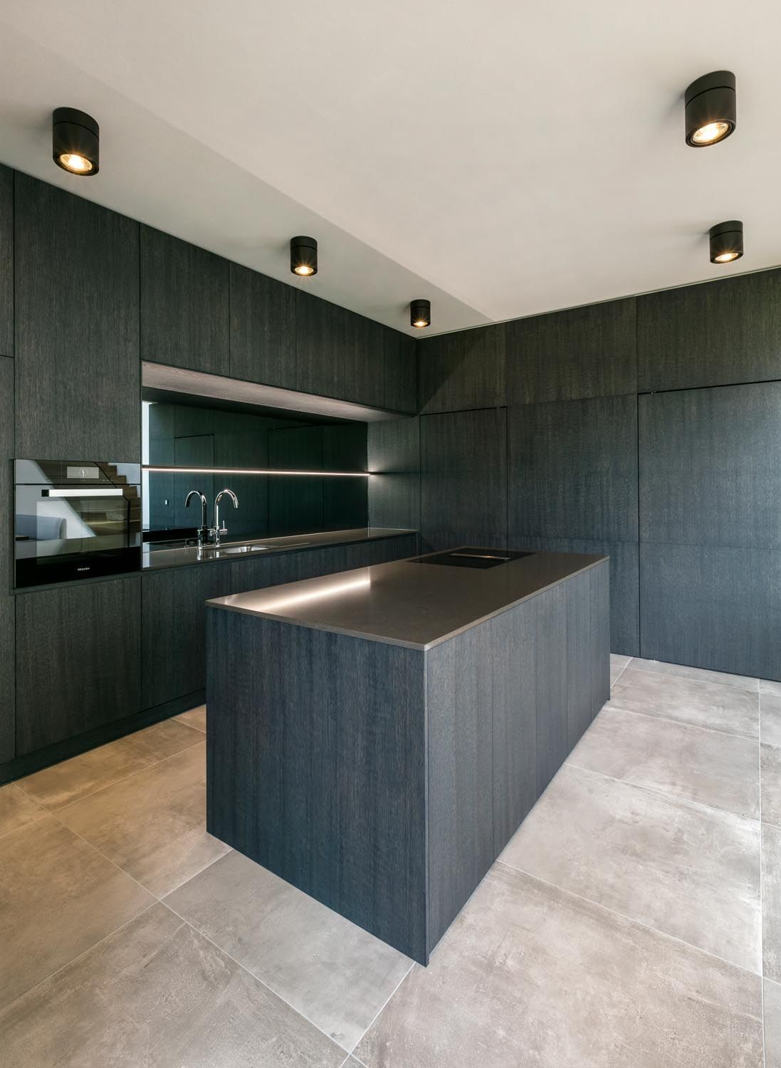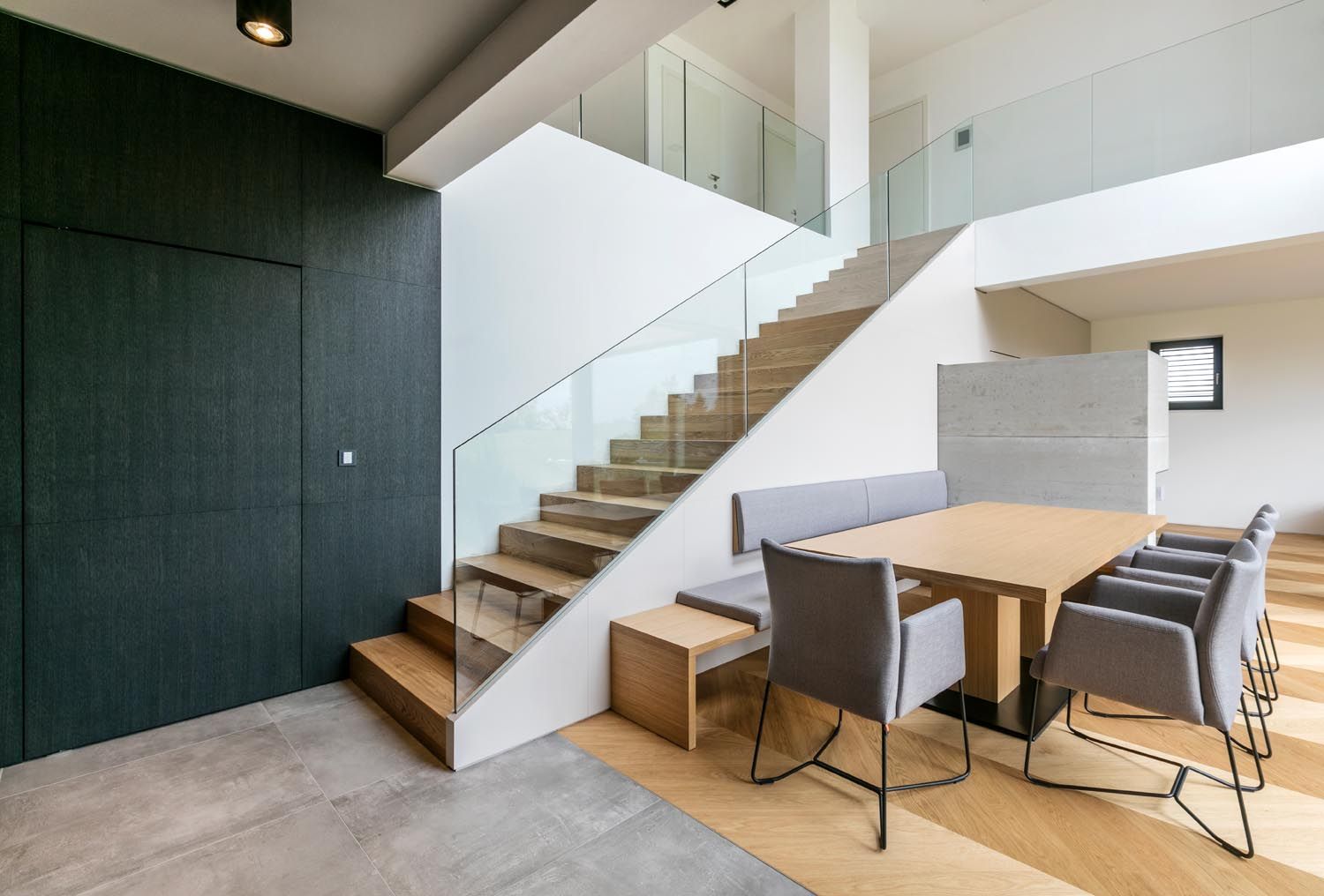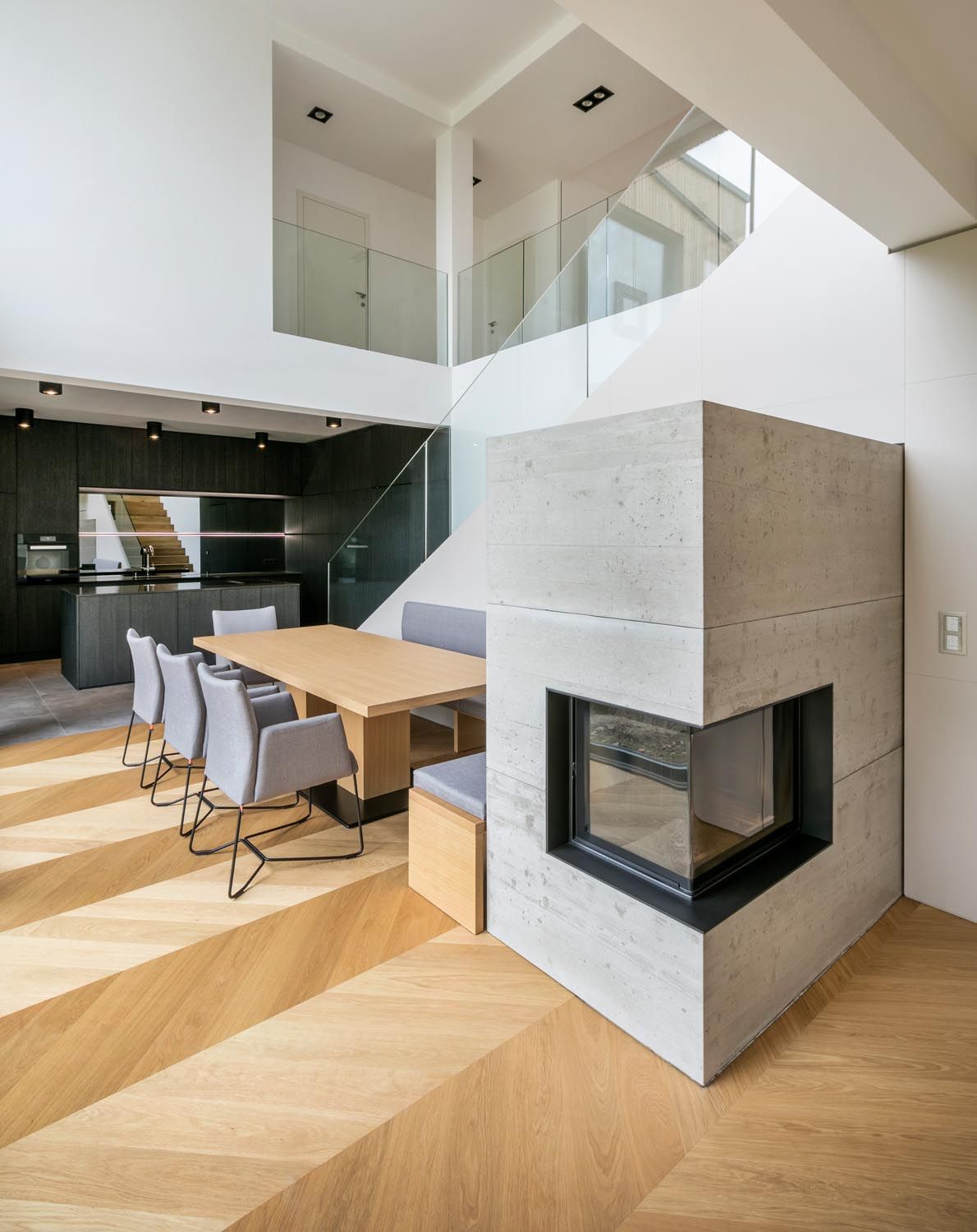 In der Küche, gebürstete und dunkel gebeizte Eichenflächen in Kombination mit einer gleichfärbigen Silestone-Platte und einer Grauspiegelrückwand. Essbereich mit Grau matt lackierten Flächen und Eiche Natur in Kombination zum Holzboden.