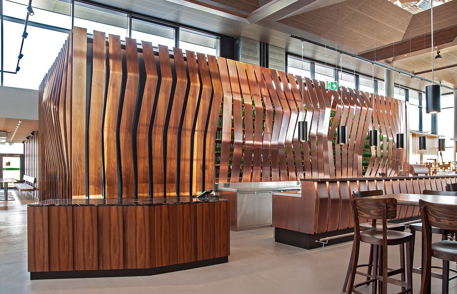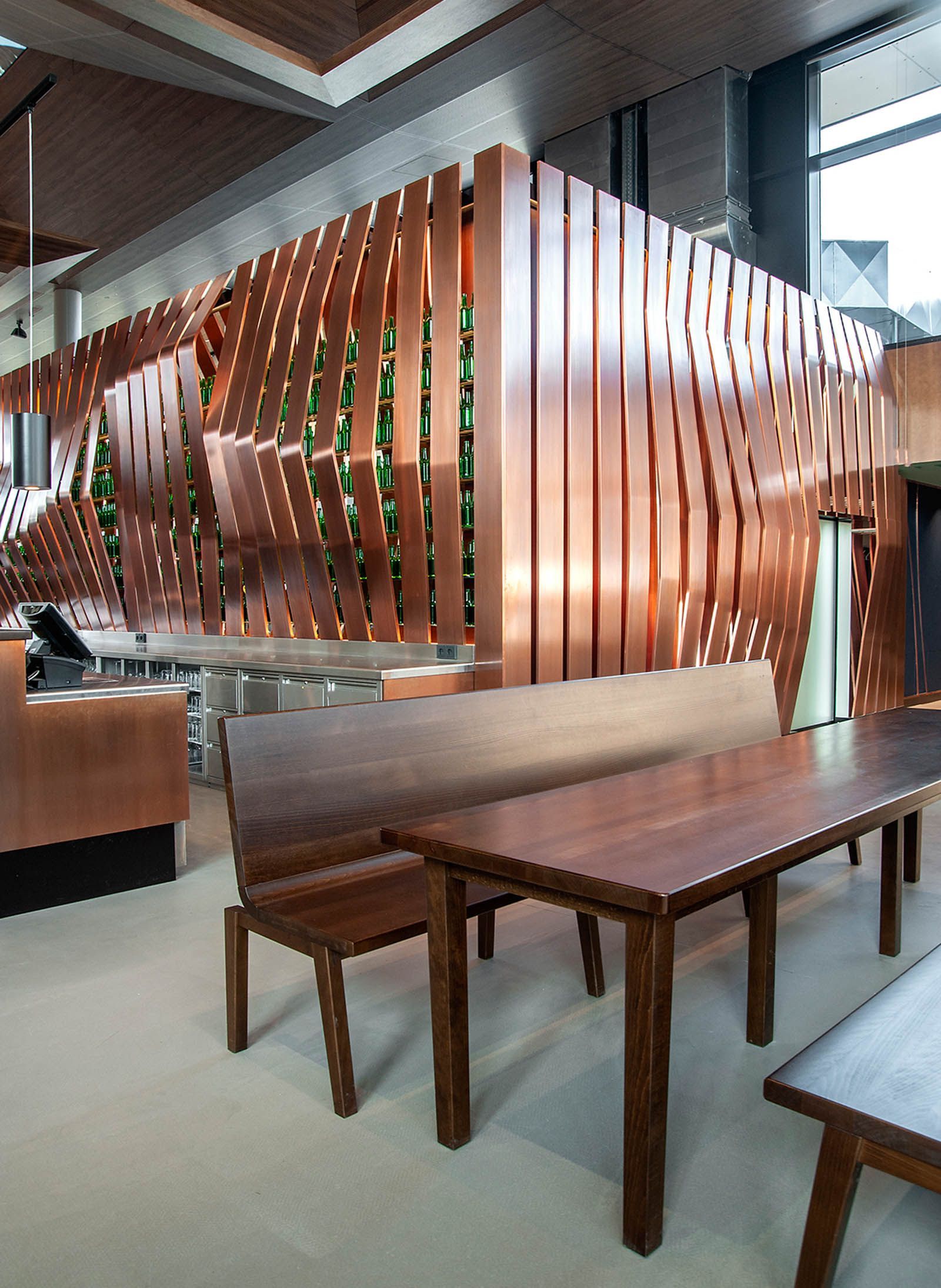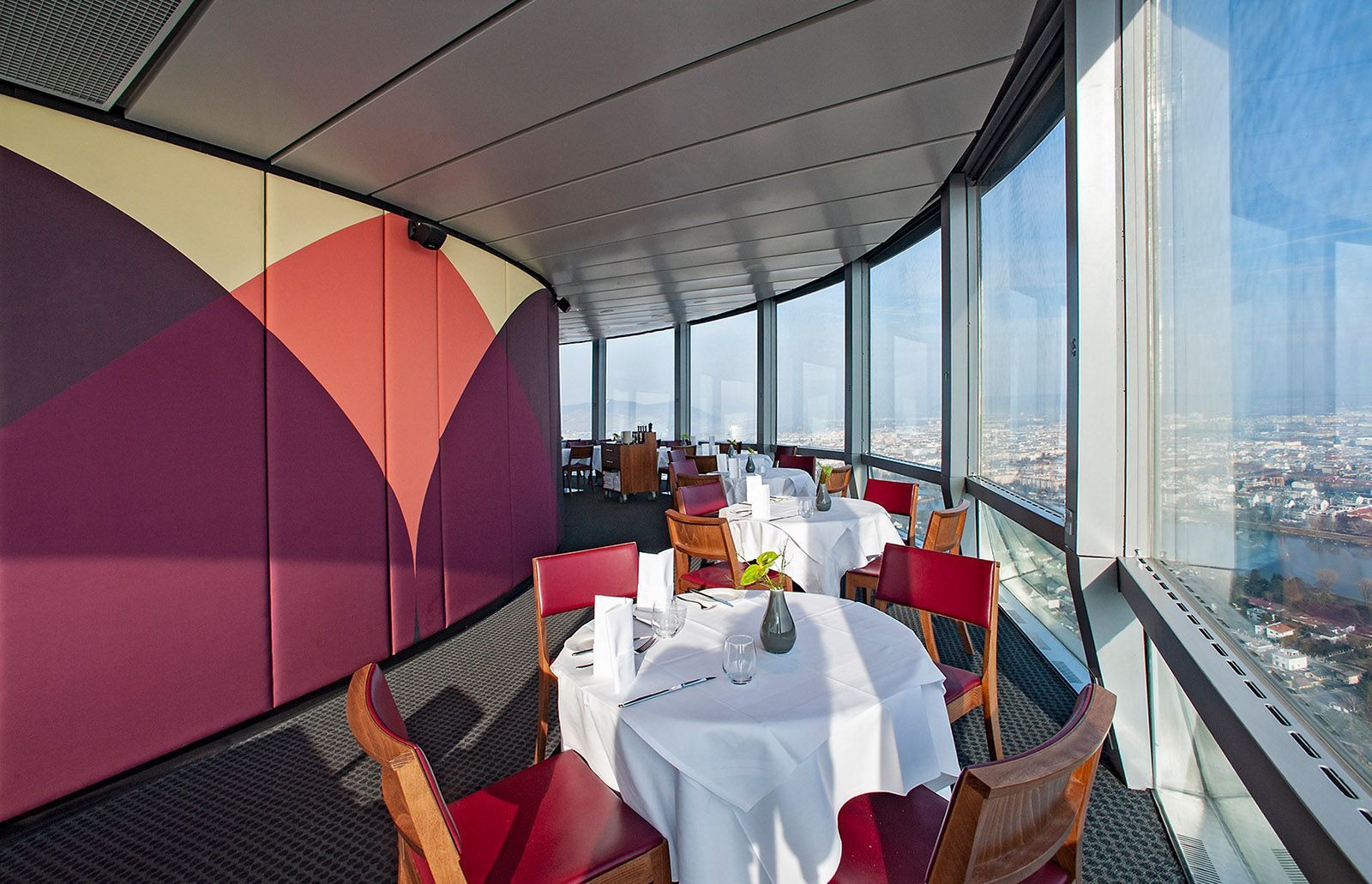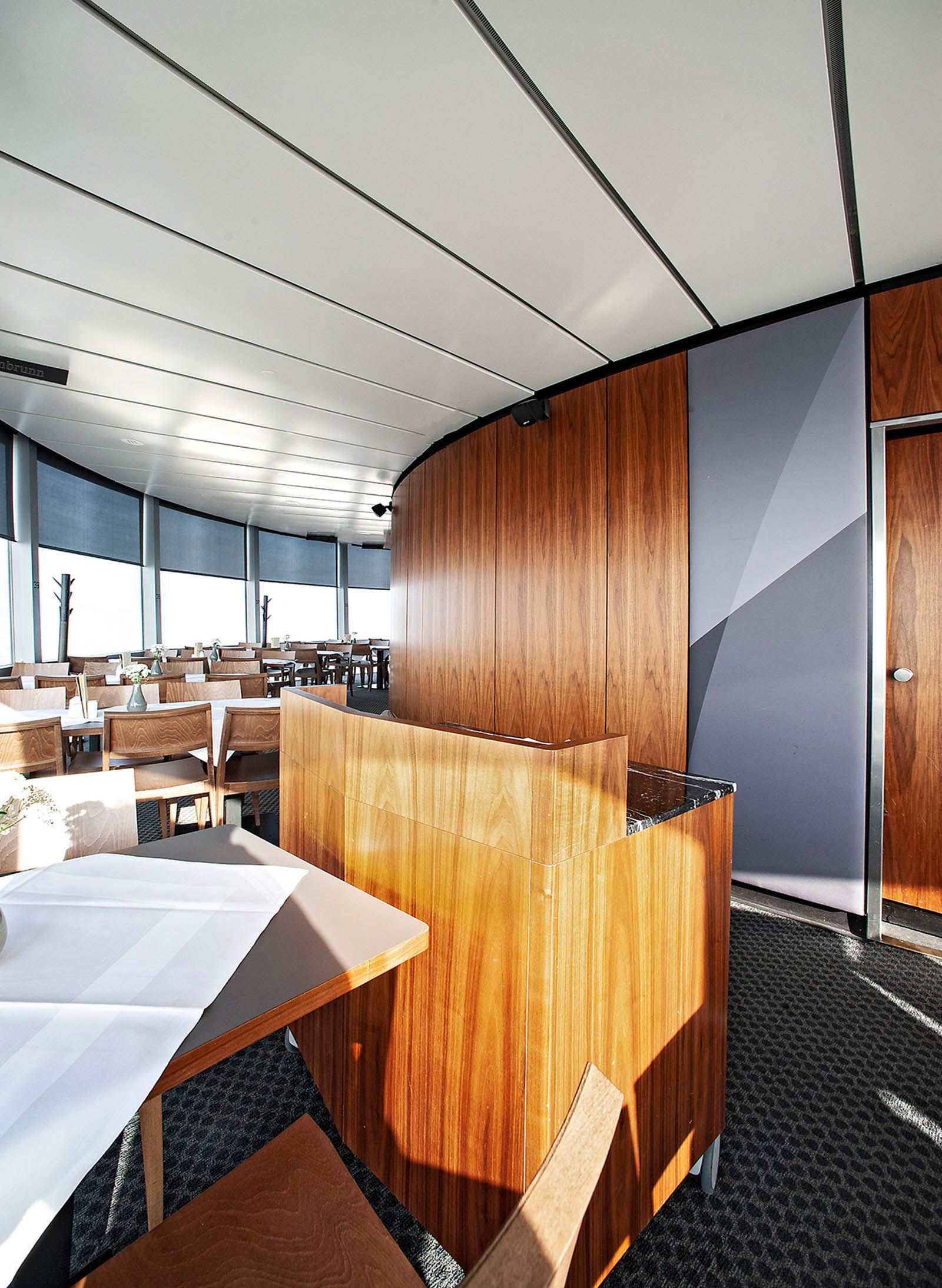 In Zusammenarbeit mit Architekten vom Büro "eichinger offices" und den Bauherrn ging es bei diesem Projekt um die Neugestaltung des Donauturm samt neuem Bierlokal. In jedem Bauabschnitt gibt es ein optisches Highlight in Verbindung mit der restlichen Einrichtung. Als ganz besondere Herausforderung galt neben der Arbeit in 178m Höhe, die gebogene und mit bedrucktem Stoff tapezierte Wandverkleidung, welche mit einem Umfang von 38m passgenau an die Turmwand montiert wurde, währenddessen sich die restliche Einrichtung um den Turm und die Verkleidung dreht. Im Erdgeschoss fällt die ganze Aufmerksamkeit auf die in drei Dimensionen gebogenen Holz- und Kupferlamellen, aber auch die Wc-anlagen spielen alle Farben.