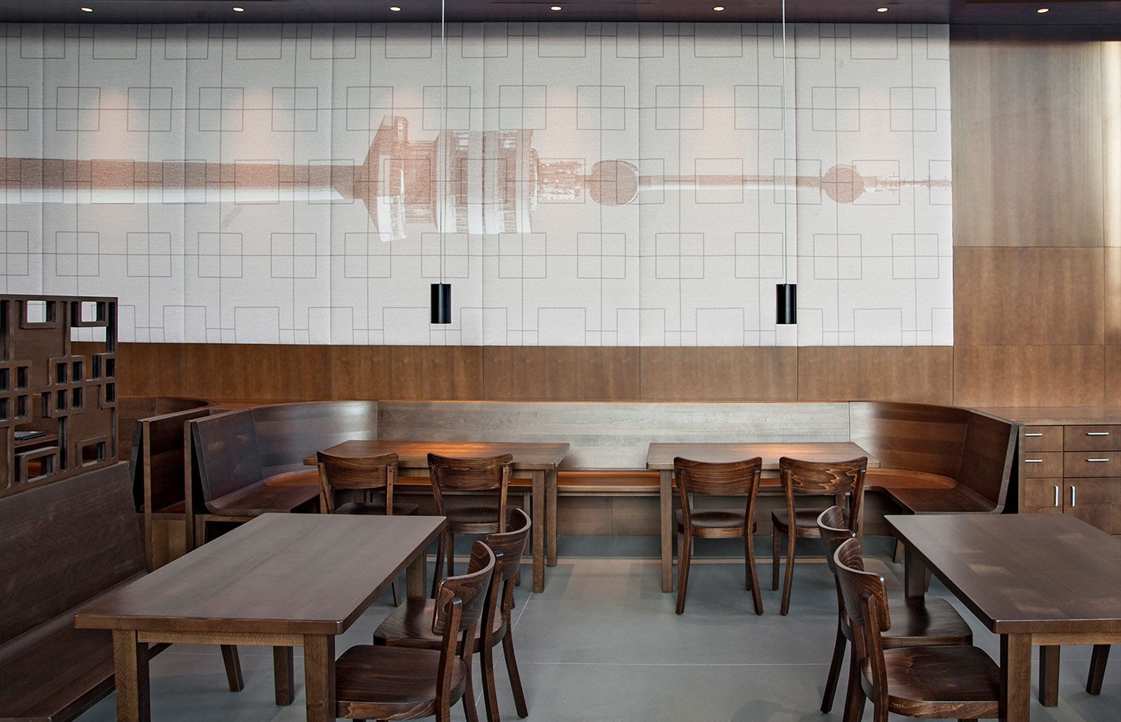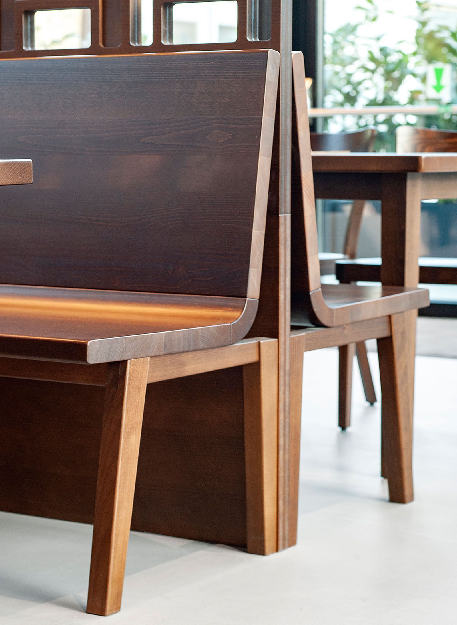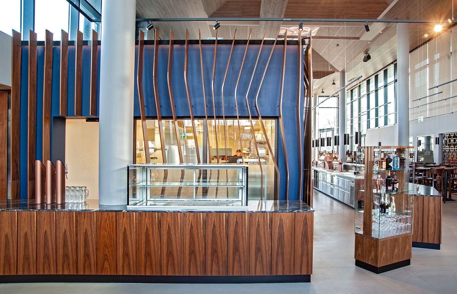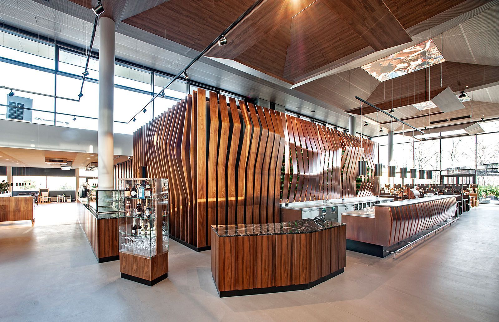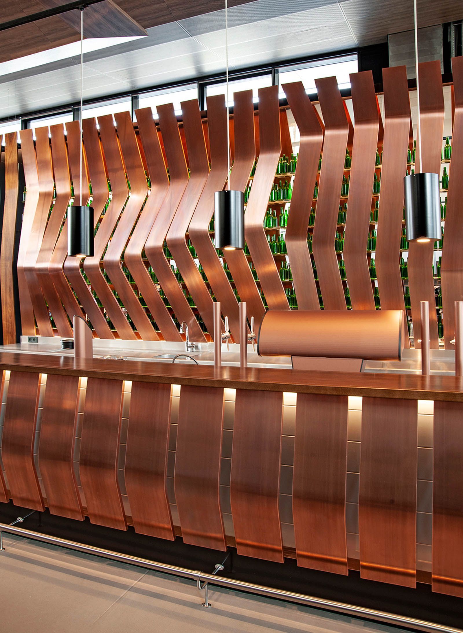 In Zusammenarbeit mit Architekten vom Büro "eichinger offices" und den Bauherrn ging es bei diesem Projekt um die Neugestaltung des Donauturm samt neuem Bierlokal. In jedem Bauabschnitt gibt es ein optisches Highlight in Verbindung mit der restlichen Einrichtung. Als ganz besondere Herausforderung galt neben der Arbeit in 178m Höhe, die gebogene und mit bedrucktem Stoff tapezierte Wandverkleidung, welche mit einem Umfang von 38m passgenau an die Turmwand montiert wurde, währenddessen sich die restliche Einrichtung um den Turm und die Verkleidung dreht. Im Erdgeschoss fällt die ganze Aufmerksamkeit auf die in drei Dimensionen gebogenen Holz- und Kupferlamellen, aber auch die Wc-anlagen spielen alle Farben.