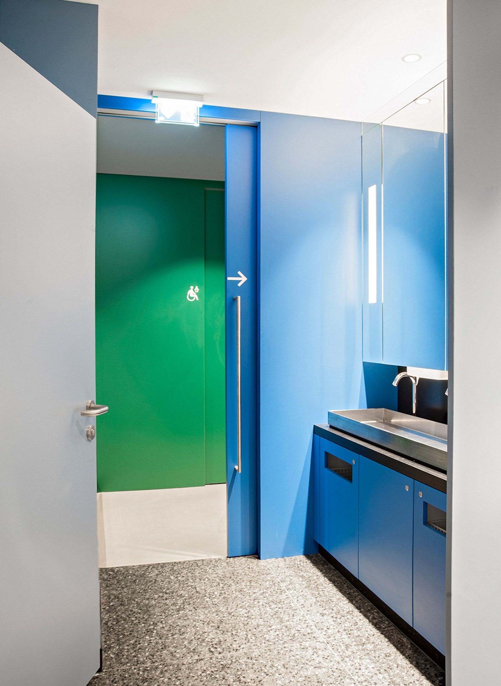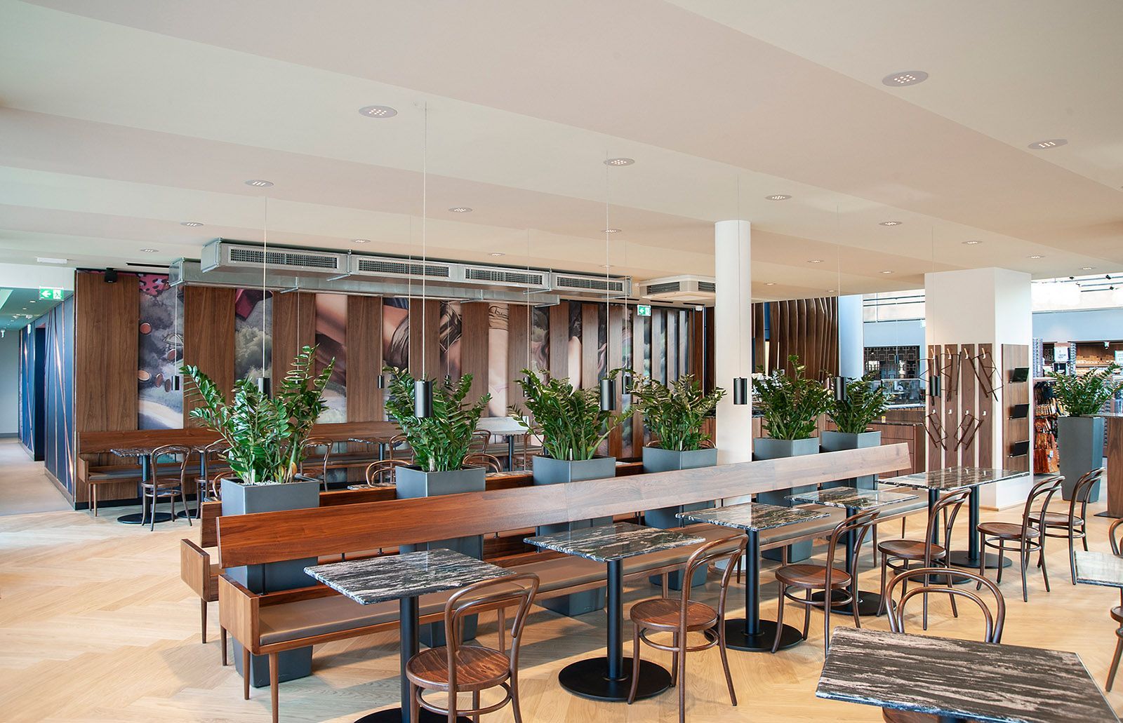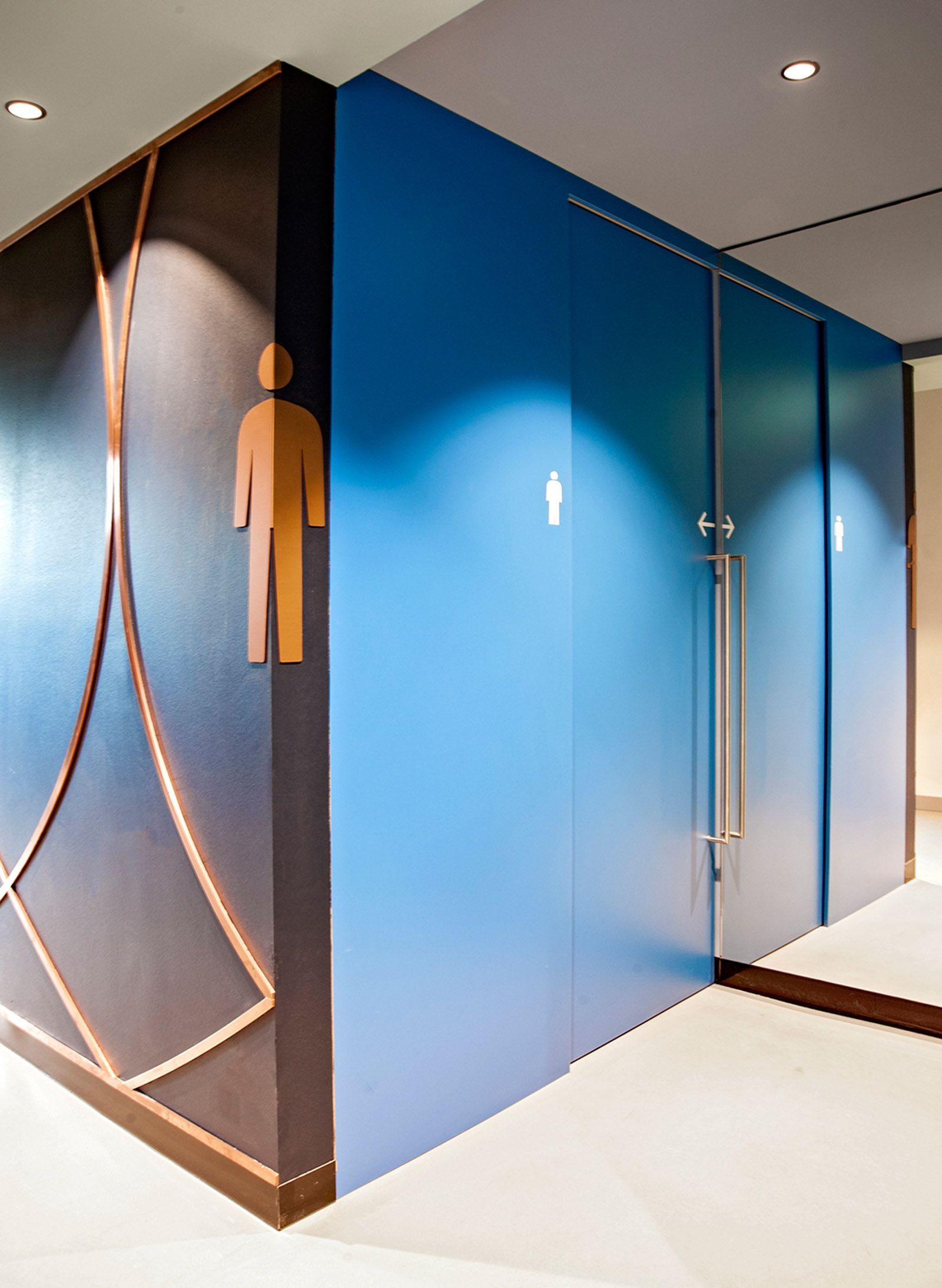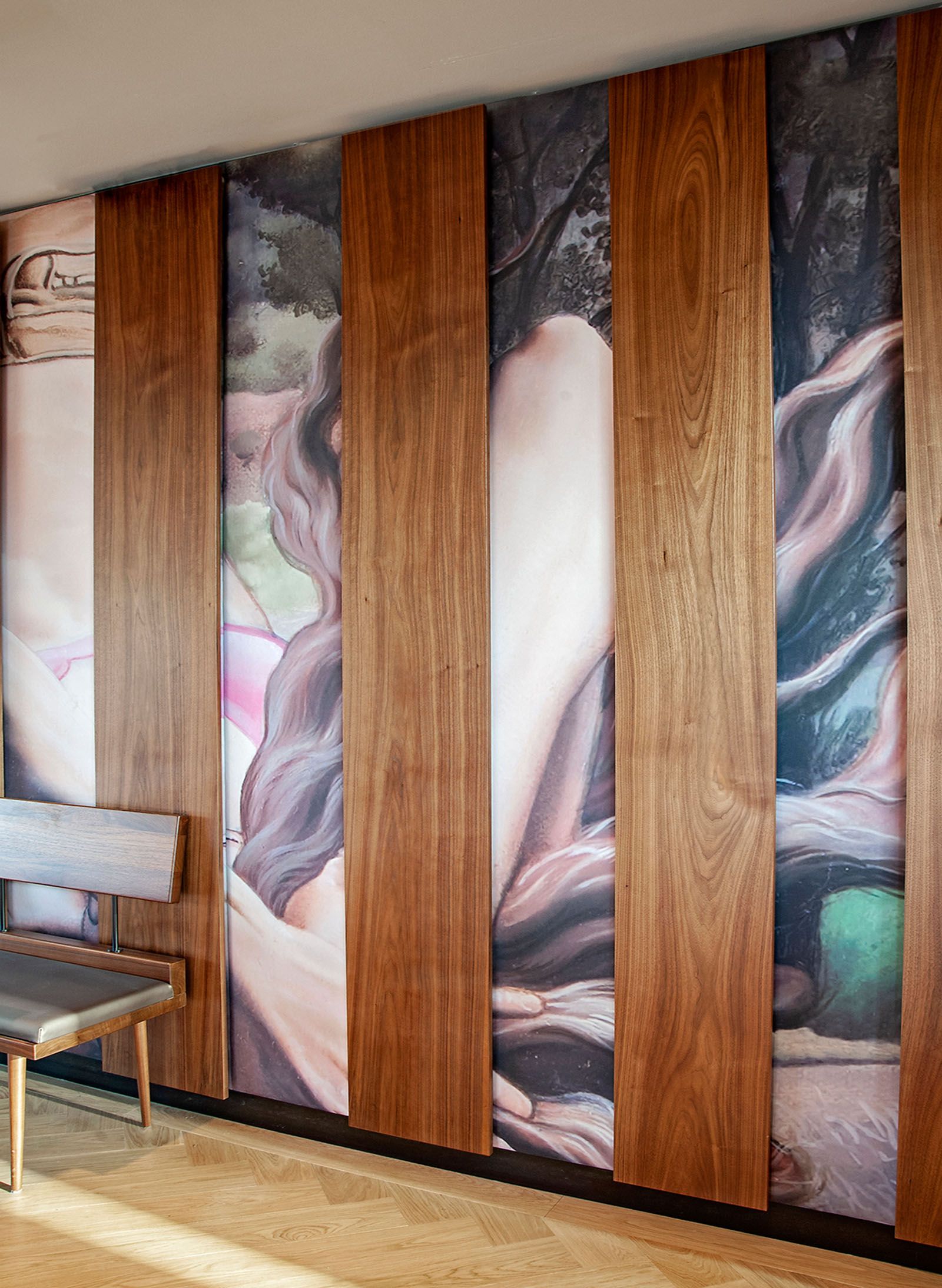 Die Auswahl der Holzoberflächen startet bei auf Nuss gebeizter Buche und endet bei deutscher Nussbaum gebeizt. Für die Steinoptik wurde dunkler Granit "Black Scorpion" verarbeitet. Für die Highlights in den einzelnen Geschossen wurden Spiegelflächen, farblich abgestimmte HPL-Beschichtungen, bedruckte Stoff- & Kupferoberflächen verwendet.