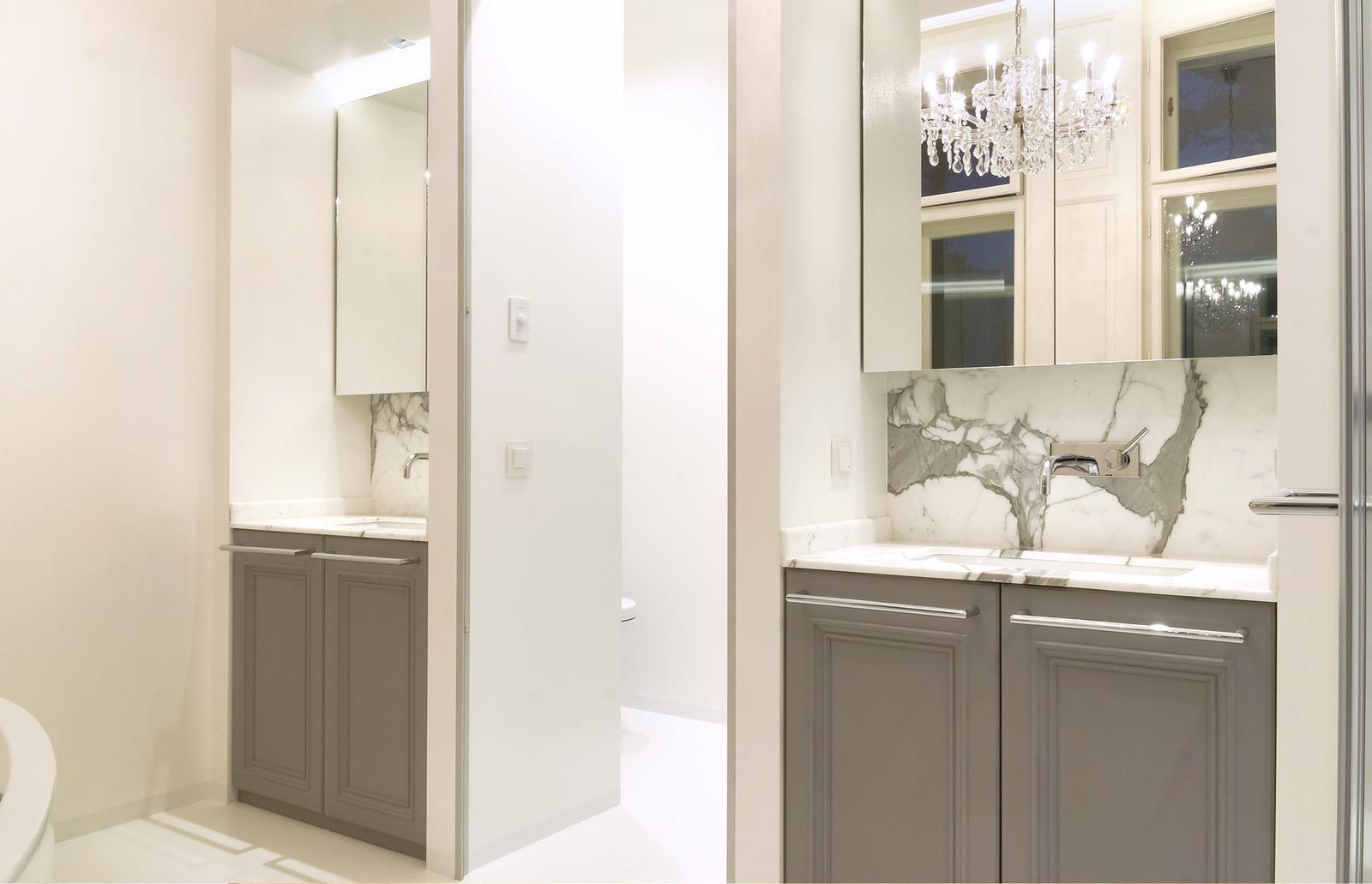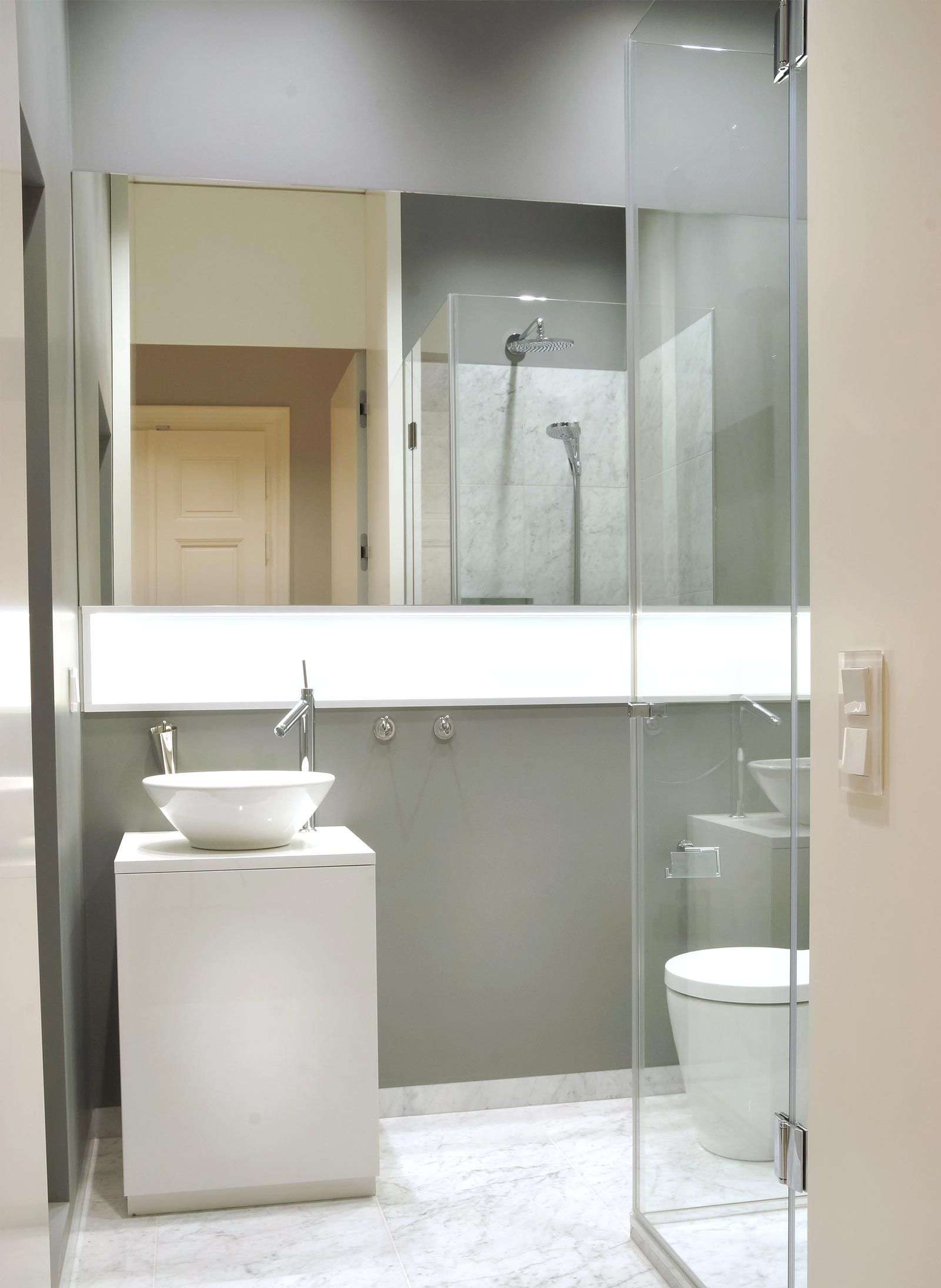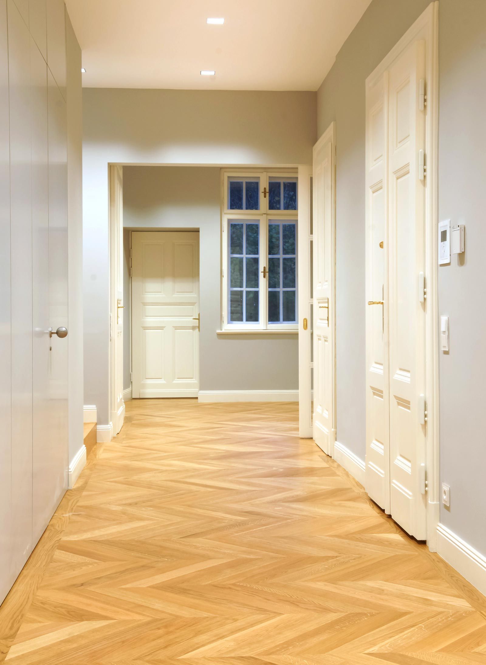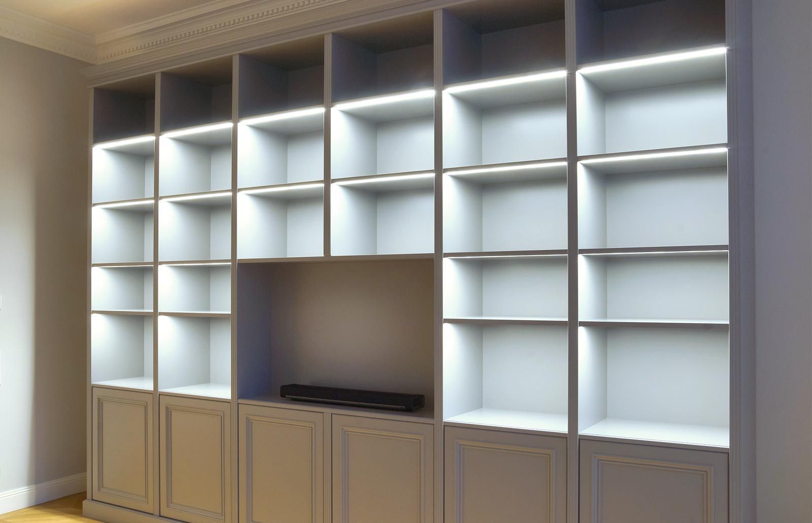 Sanierung eines hochwertigen Altbaus ist immer wieder eine Herausforderung. Hier ist es uns sehr wichtig, alte Werte zu erhalten und mit moderner, neuer Technik zu verbinden. Einerseits musste sehr viel Stauraum geschaffen werden, dafür wurden Mauernischen mit raumhohen Einbauschränken verbaut und für die grifflosen Fronten die Wandfarbe übernommen. Andererseits war es auch der Anspruch des Kunden klassische Möbel, passend zum Stil der Wohnung, zu haben. Hier als Beispiel der Bibliotheksschrank mit Rahmenfronten, profiliertem Sockel und Gesims und gesteuerter LED-Beleuchtung.