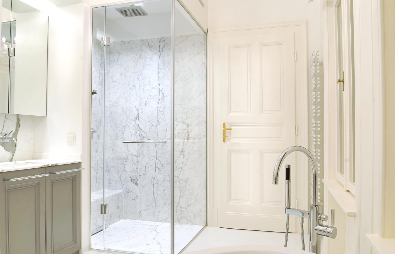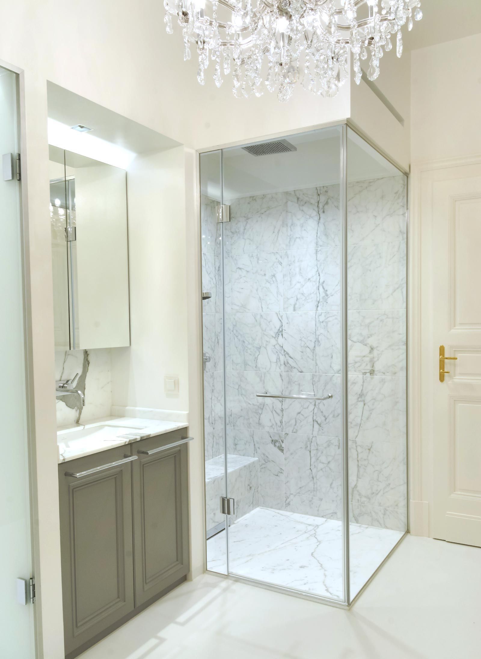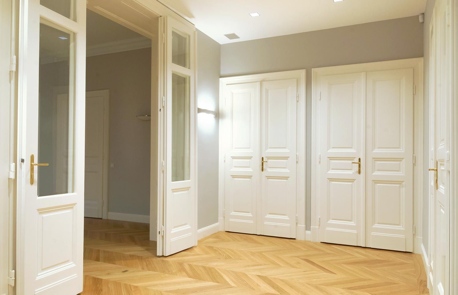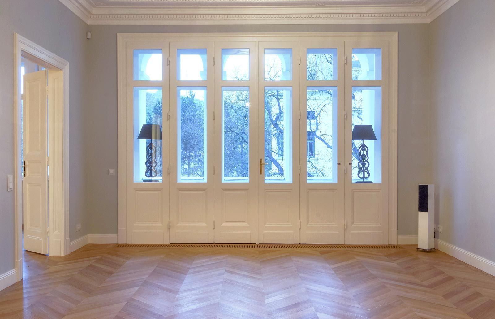 Sanierung eines hochwertigen Altbaus ist immer wieder eine Herausforderung. Hier ist es uns sehr wichtig, alte Werte zu erhalten und mit moderner, neuer Technik zu verbinden. Einerseits musste sehr viel Stauraum geschaffen werden, dafür wurden Mauernischen mit raumhohen Einbauschränken verbaut und für die grifflosen Fronten die Wandfarbe übernommen. Andererseits war es auch der Anspruch des Kunden klassische Möbel, passend zum Stil der Wohnung, zu haben. Hier als Beispiel der Bibliotheksschrank mit Rahmenfronten, profiliertem Sockel und Gesims und gesteuerter LED-Beleuchtung.