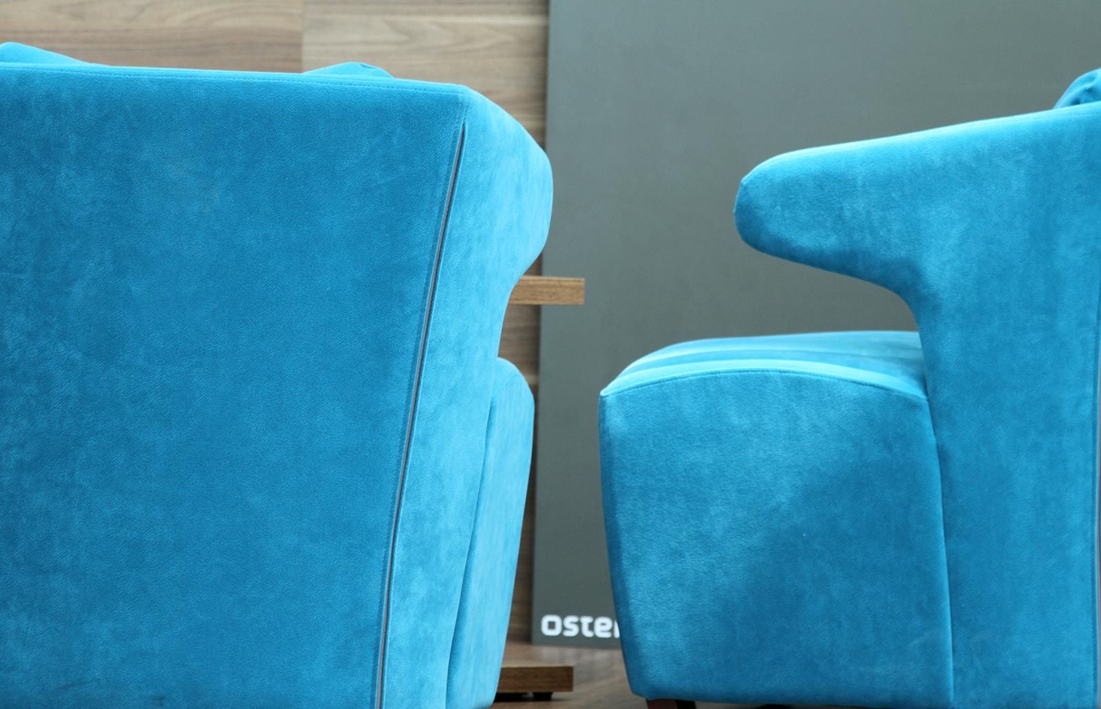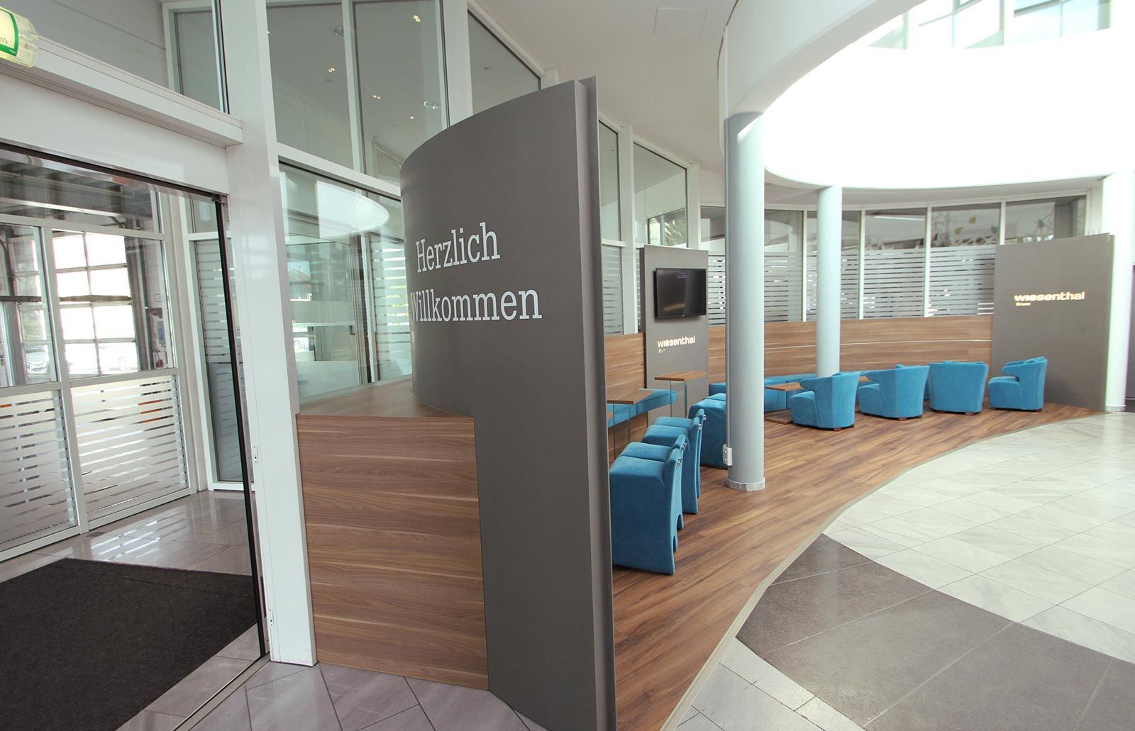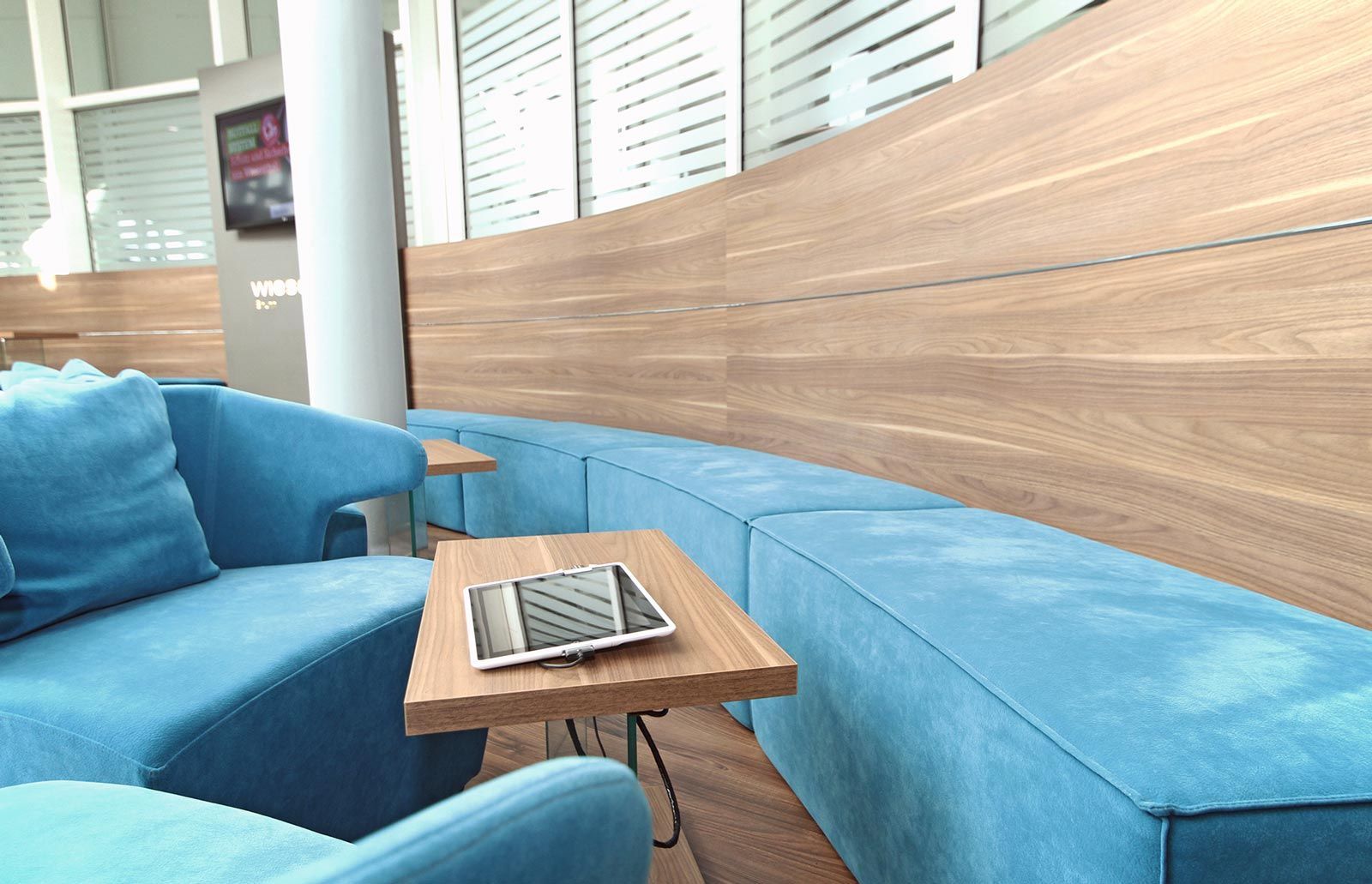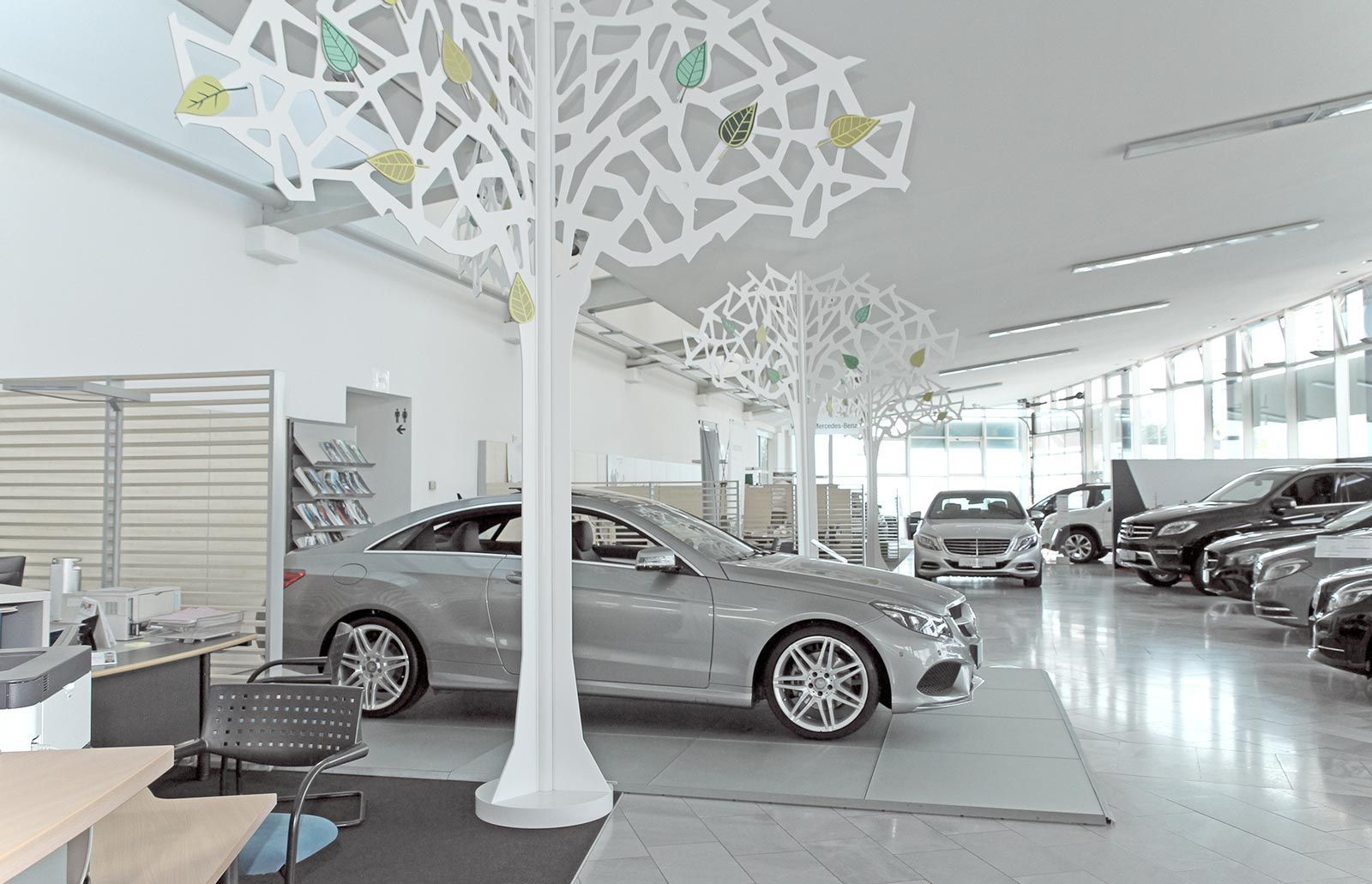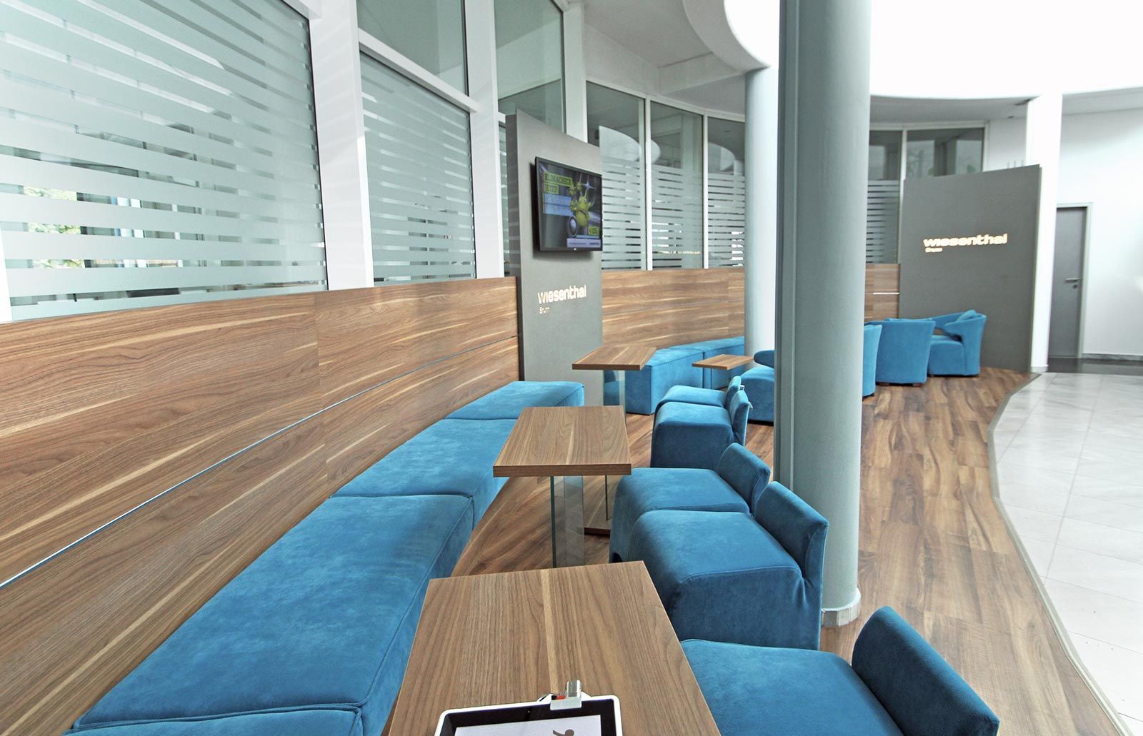 Gestaltung einer Wartezone in einem Mercedes-Betrieb. Die an das Gebäude angepasste, geschwungene Formsprache fügt den Wartebereich verlaufend in den Schauraum ein und bietet dem Kunden die gewohnte Qualität. Ein Highlight bildet die in Petrol gehaltenen Tapezierung mit roten Sichtnähten.