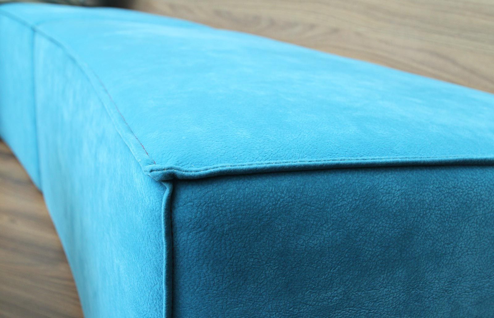 Nussholzflächen kombiniert mit farblich abgestimmten Corian und Tapezierungen in Petrol mit roten Sichtnähten.