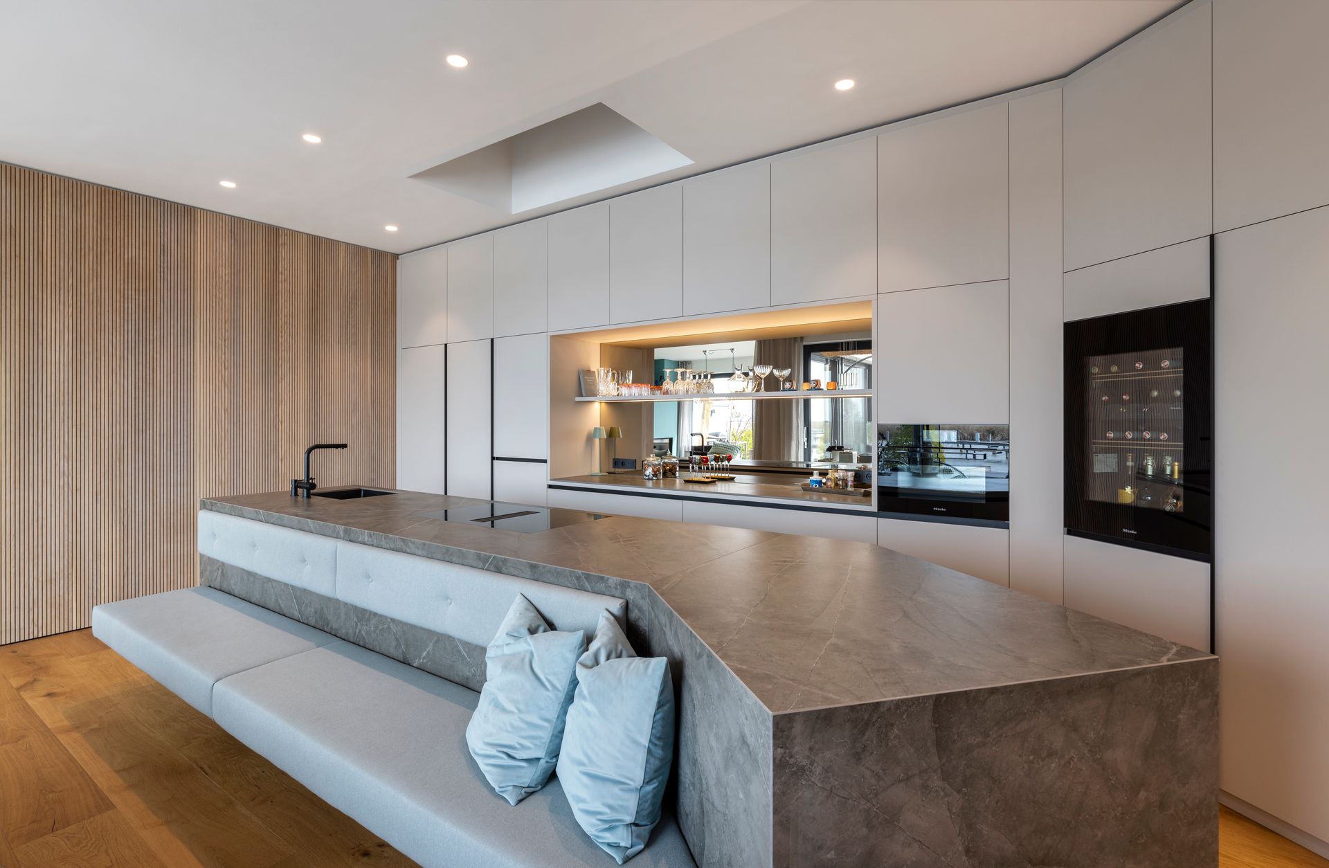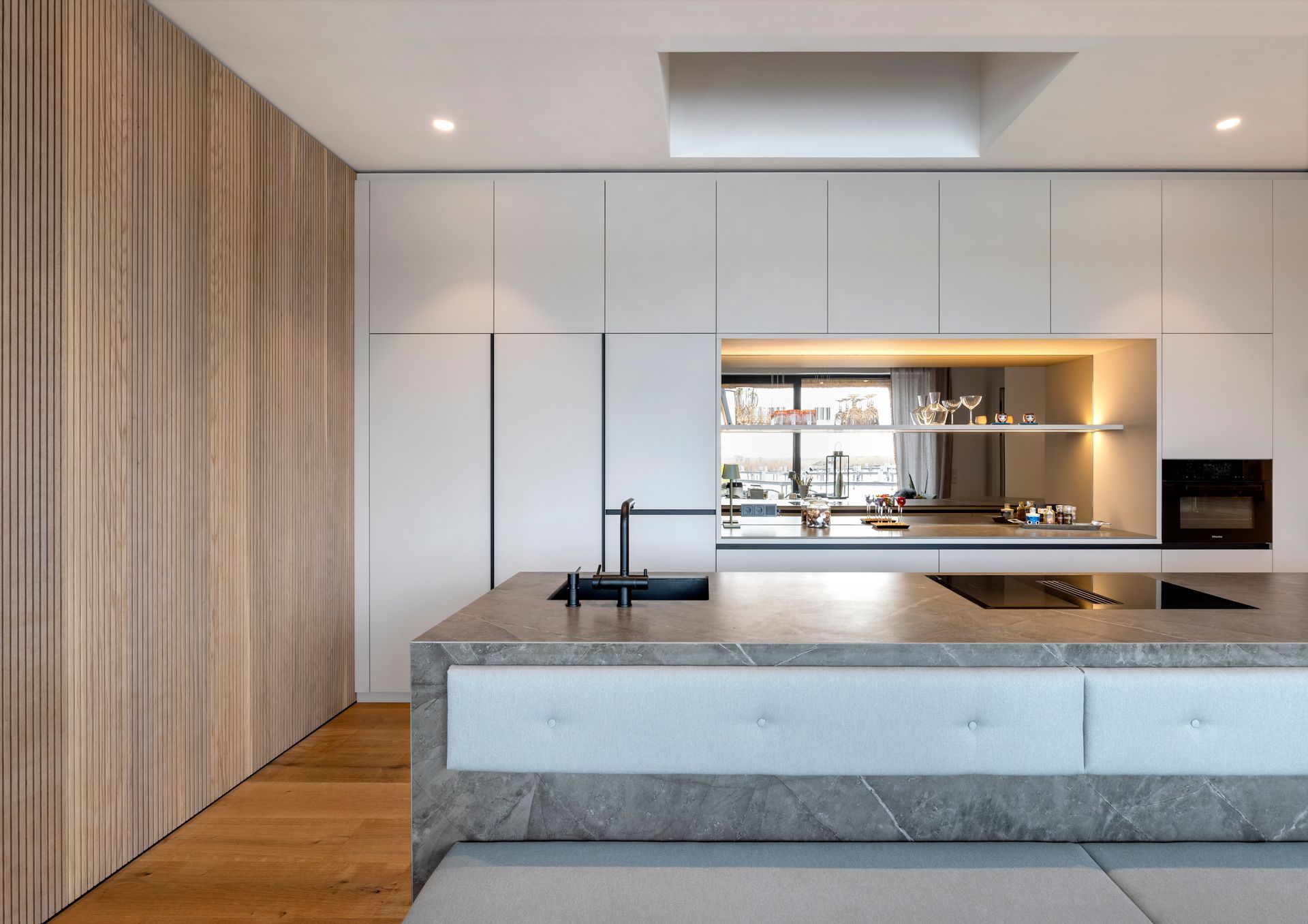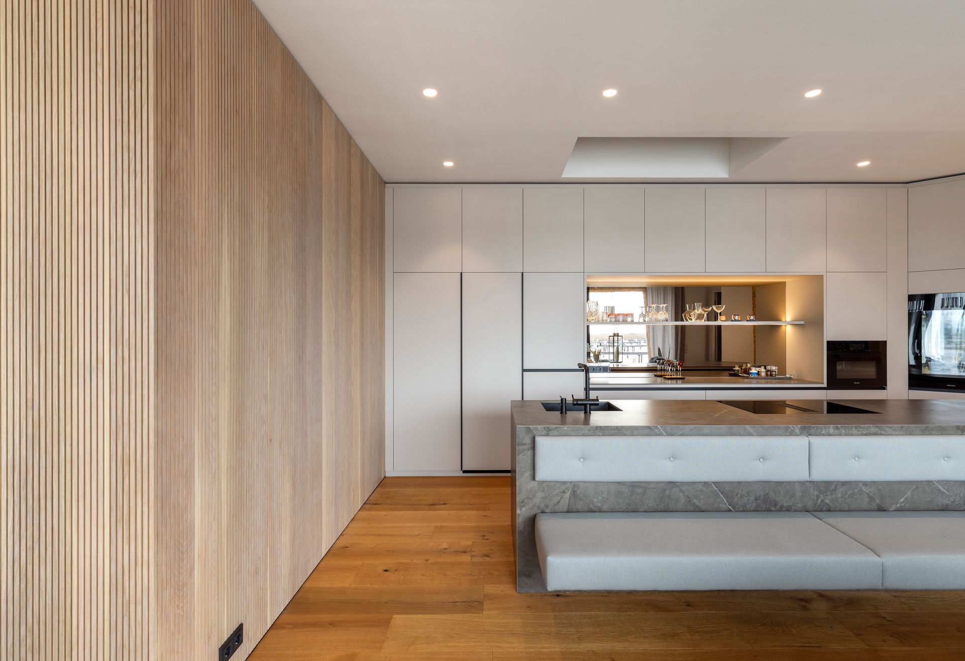 Die Küchenarbeitsplatte wurde mit einer Dekton -Keramik Kira auf Gehrung mit Strukturverlauf ausgeführt.
