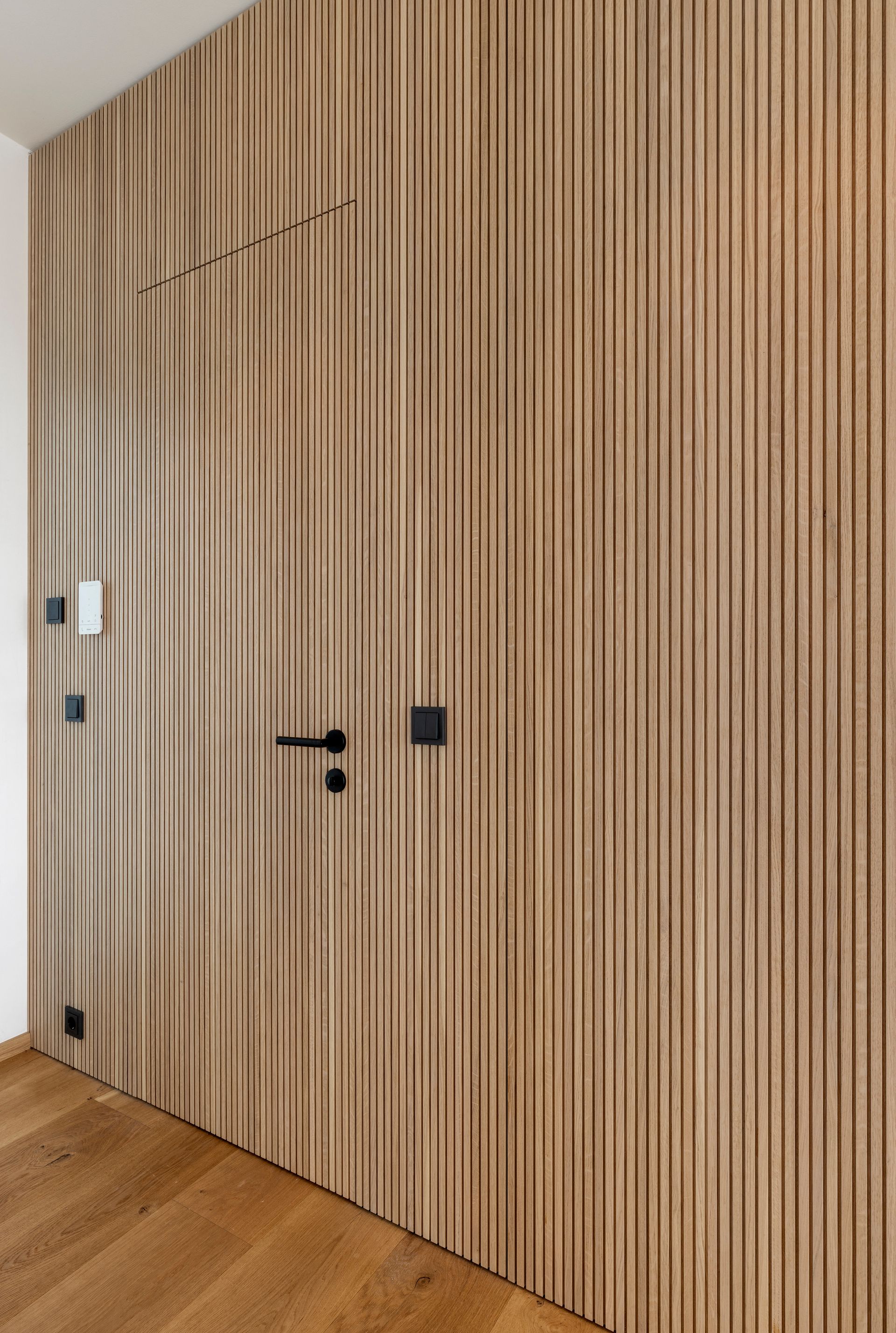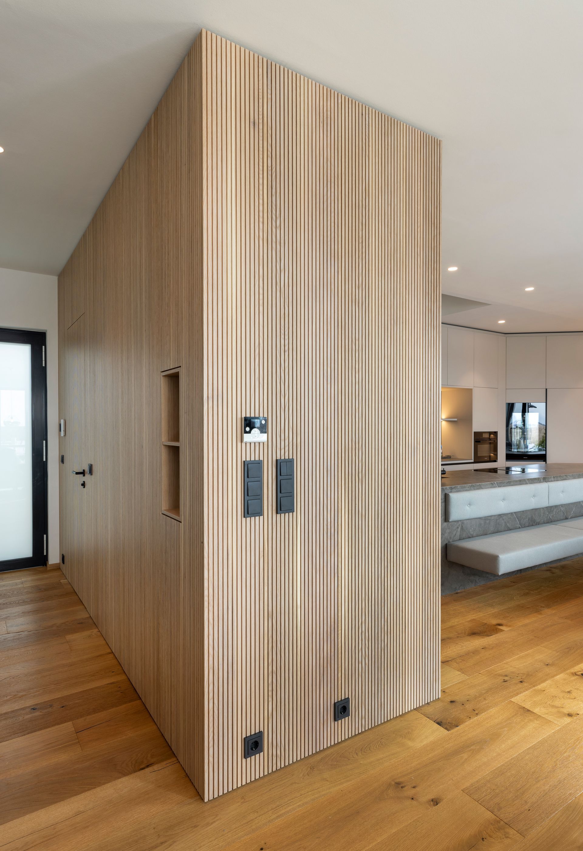 Als weiteres Design-Highlight gilt die Wandverkleidung in Lamellenoptik welche den Eingangsbereich mit dem restlichen Wohnraum verbindet und auch Stauraum und einen Raumzugang verbirgt.