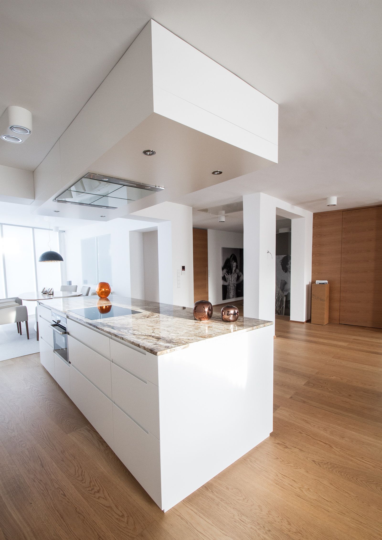 Neugestaltung einer Wohnküche als Mittelpunkt des Wohnbereiches, mit dem Anspruch an mehr Arbeitsfläche, aber auch an strukturiertes Arbeiten. Ein wichtiger Punkt und auch das Ziel bei der Planung war, die Küche als Möbel in den Wohnraum einzugliedern und mit der Steinplatte ein optisches Highlight zu erzielen. Für die tägliche gebrauchten Küchengeräte wie z.B. Kaffeemaschine wurde im Hochschrank eine Arbeitsfläche installiert, um diese immer bedienbereit zu haben, aber dennoch einen optisch aufgeräumten Eindruck zu haben.