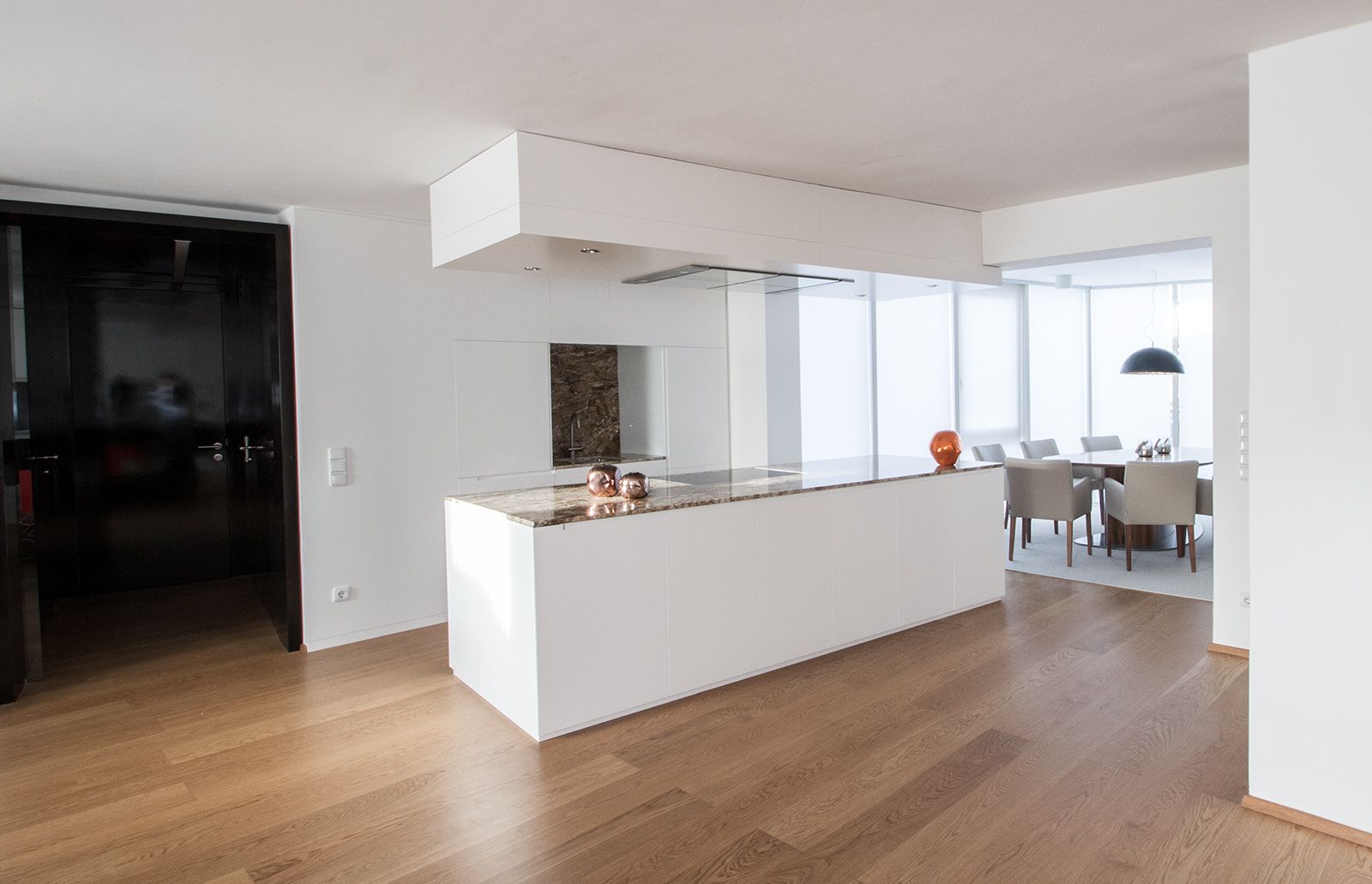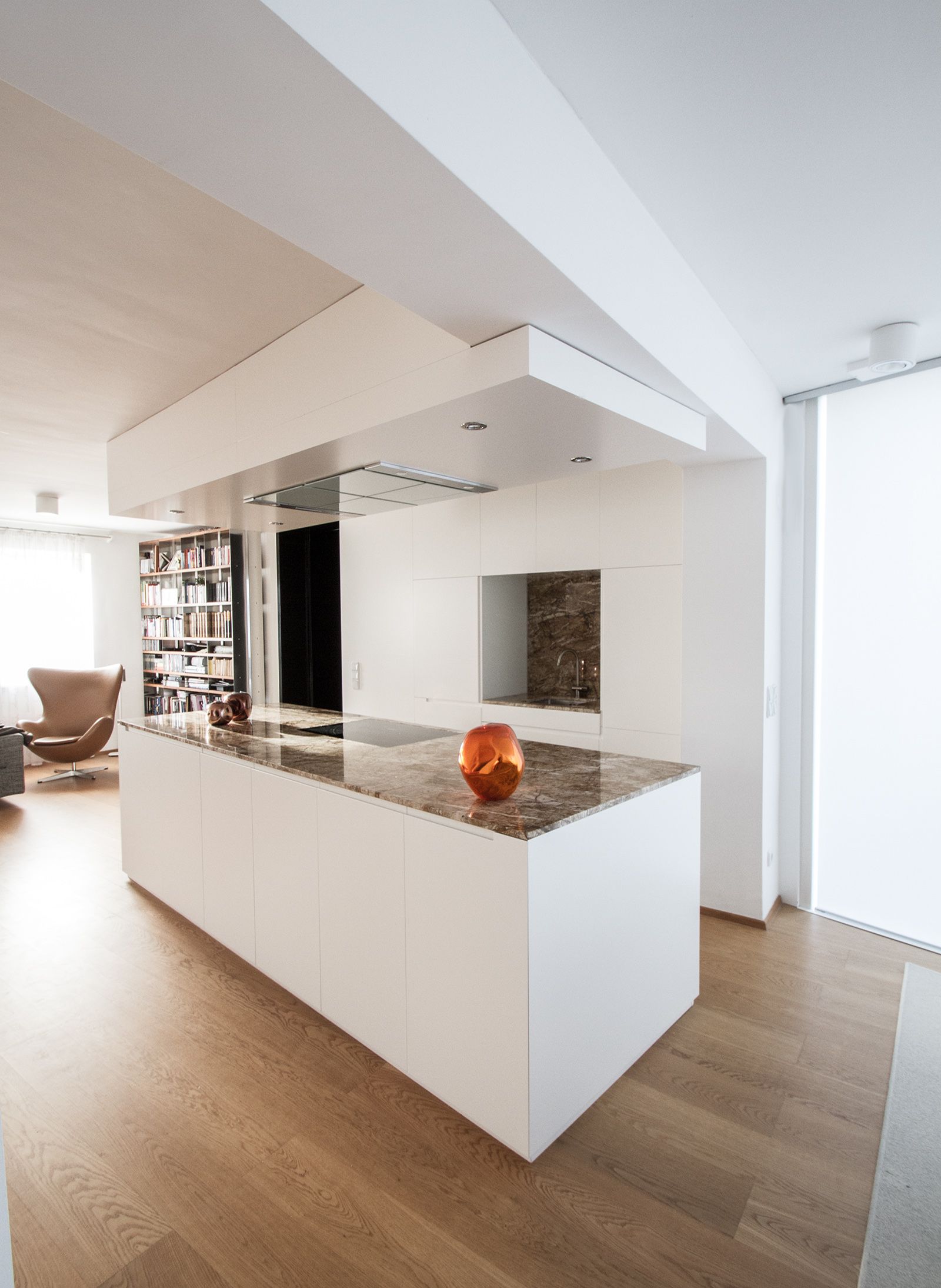 Sichtflächen in weißem Schleiflackflächen, Stein - Emperador Light mit färbig lackiertem Glas.