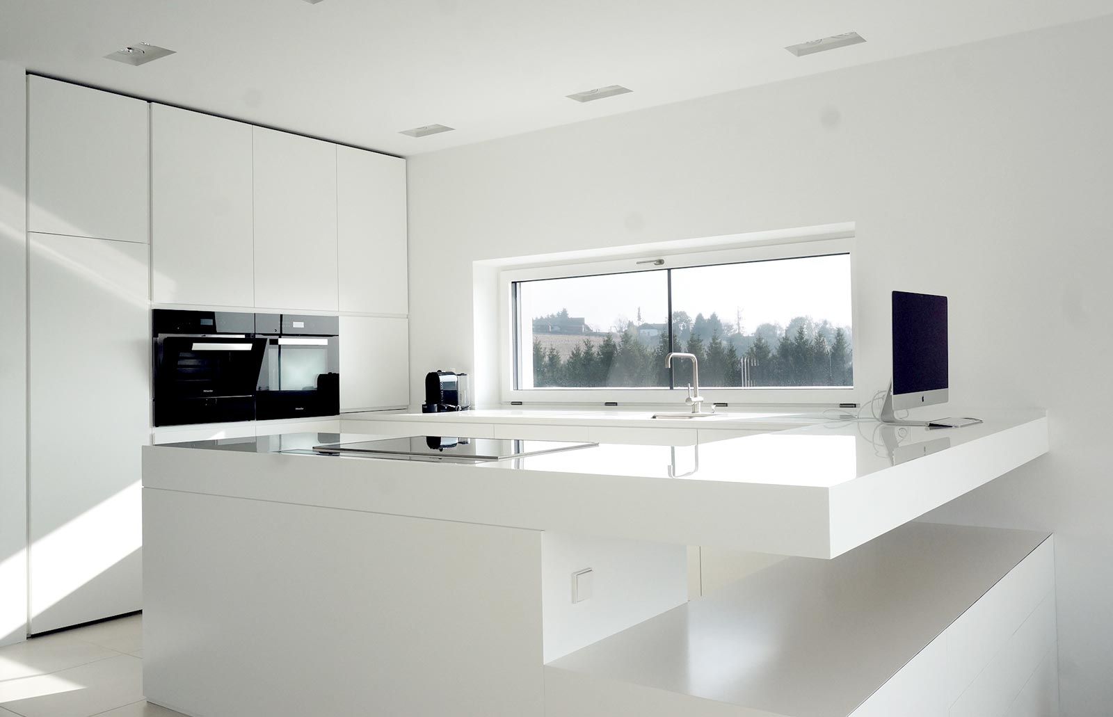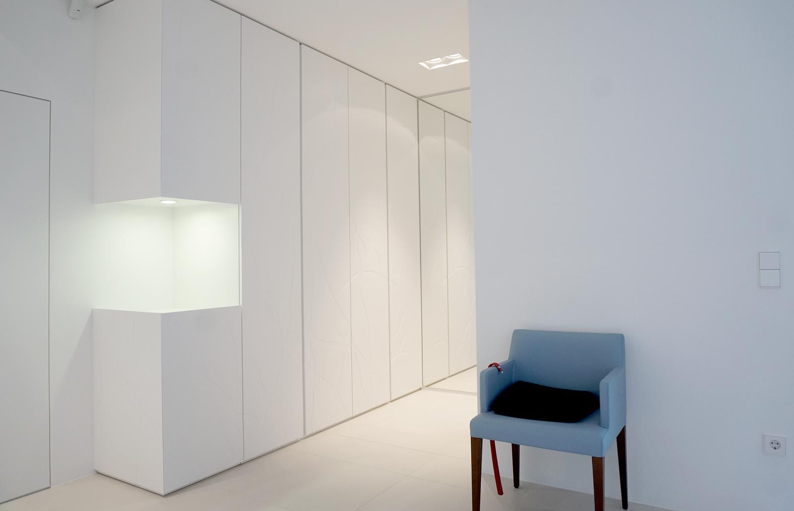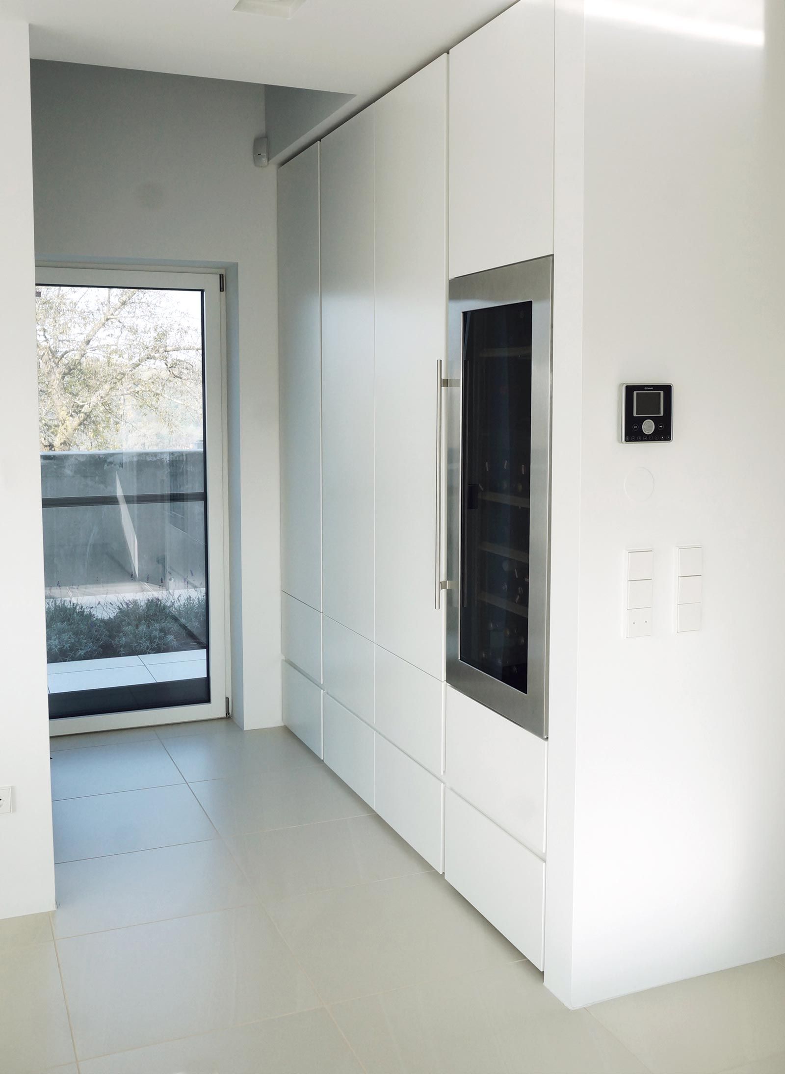 Farblich abgestimmte Schleiflackflächen in Kombination mit Leder, Corian, Glas, Stein und Fliesenboden, machen dieses Projekt besonders.