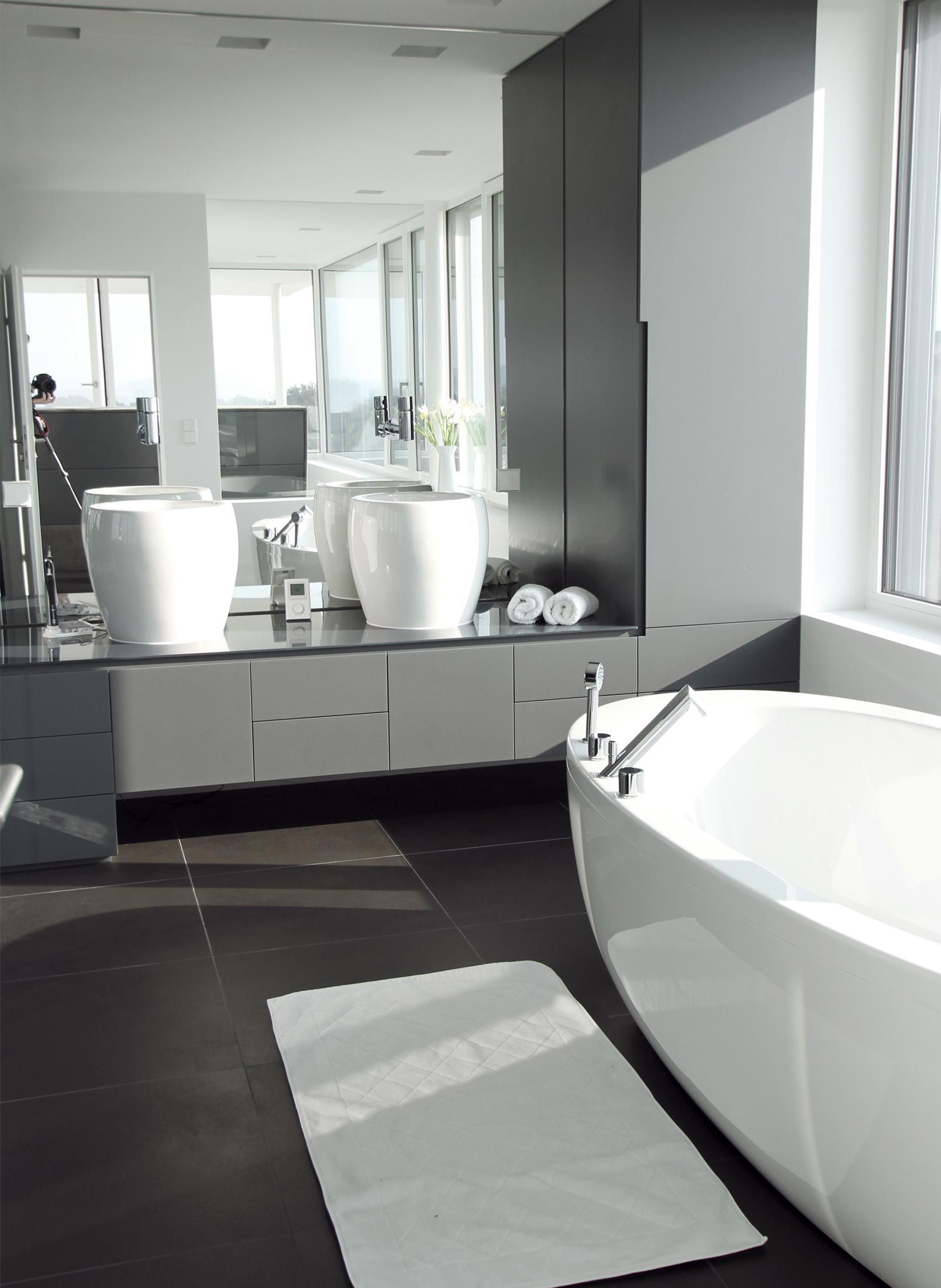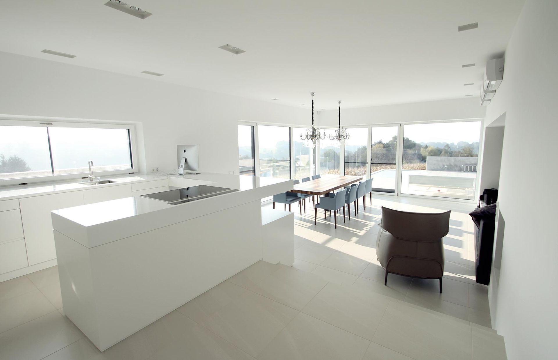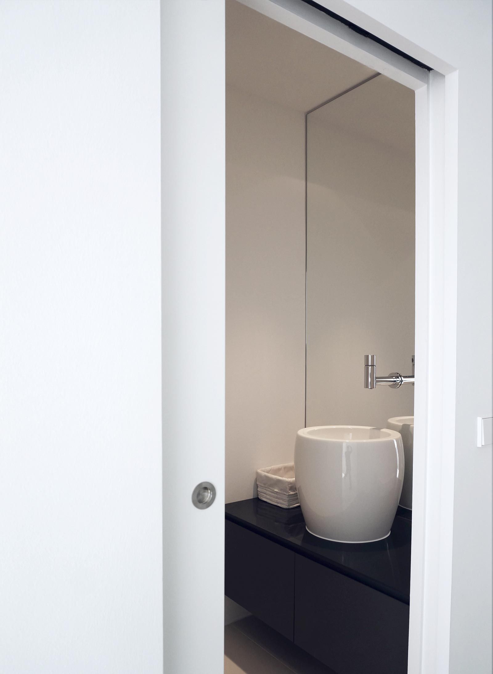 Farblich abgestimmte Schleiflackflächen in Kombination mit Leder, Corian, Glas, Stein und Fliesenboden, machen dieses Projekt besonders.