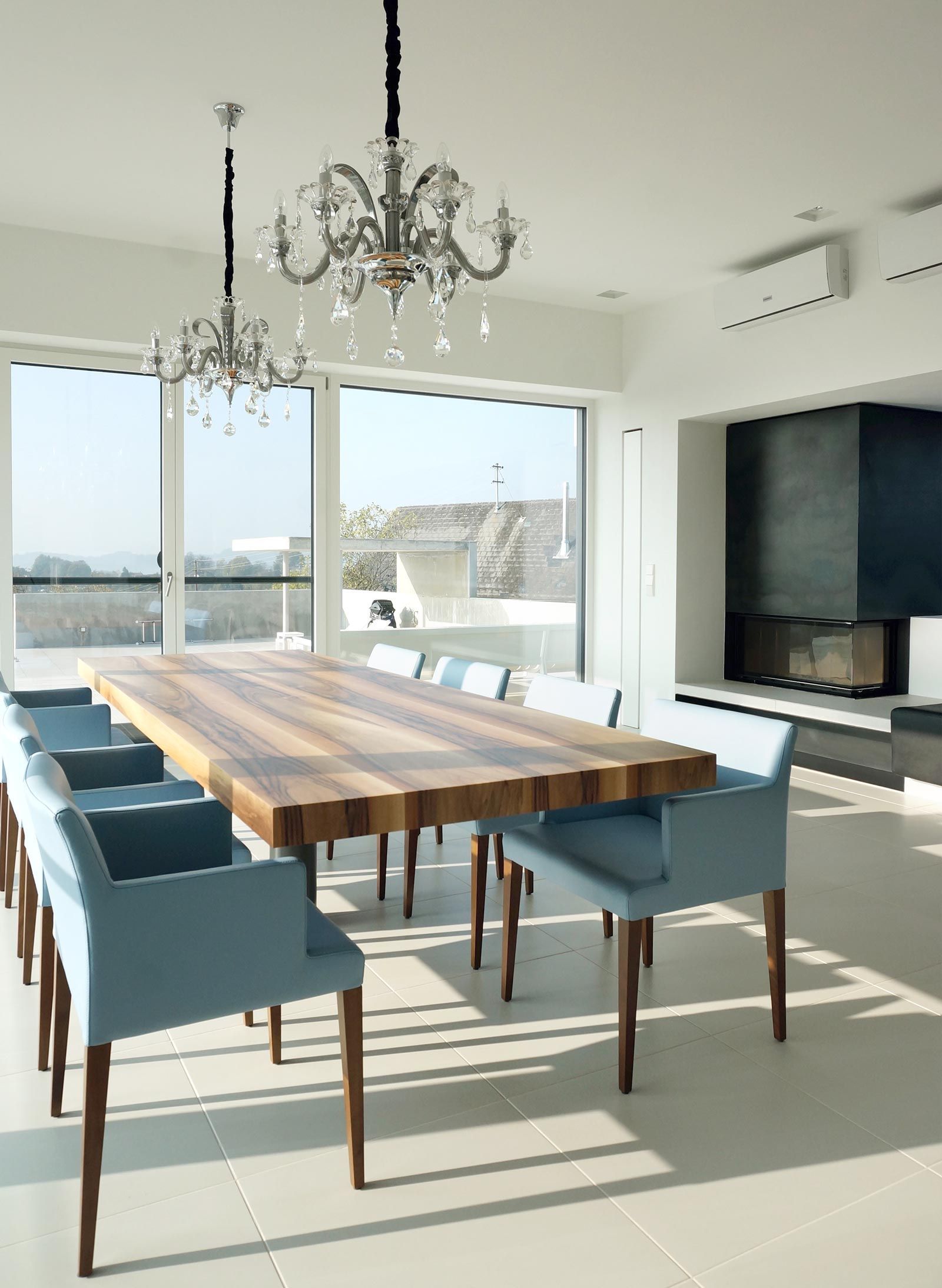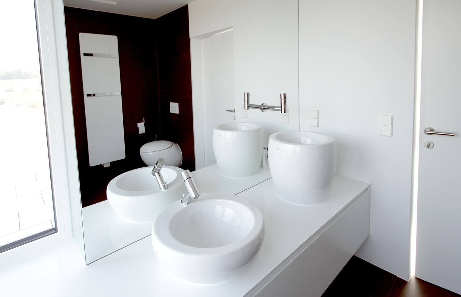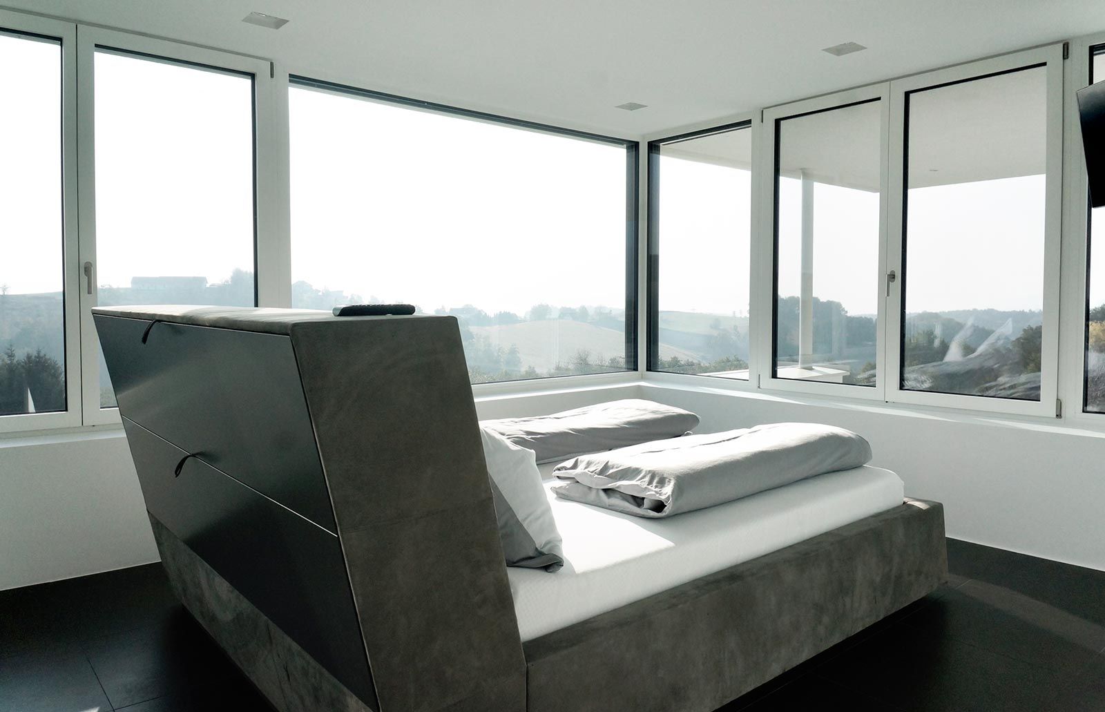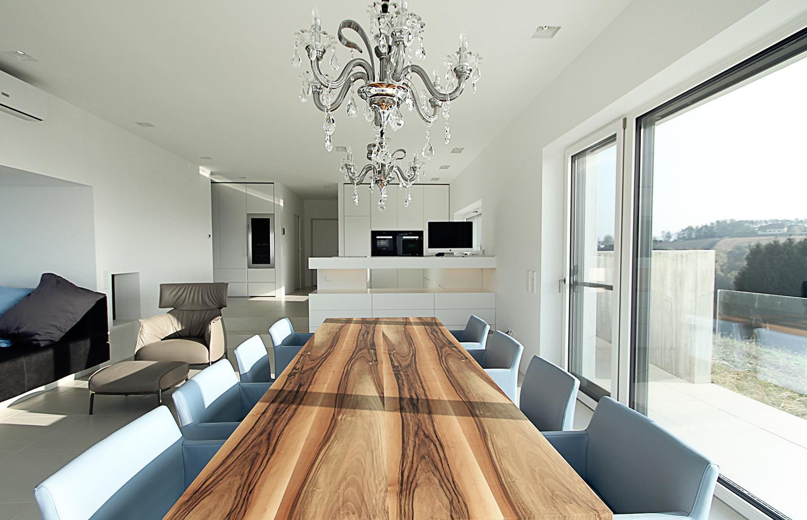Planung eines Hauses im Burgenland. Schlichte, architektonische Formsprache mit flächenbündigen Schrankfronten in Kombination mit Oberflächenfräsungen als punktuell gesetztes Highlight. Die Küche im Wohnraum erfüllt alle Ansprüche und passt sich optisch der Geradlinigkeit des Objektes an. Details wie ein optisch frei schwebender Holztisch unterstreichen die Besonderheit dieses Projektes. Auch das Badezimmer und Schlafzimmer lassen keine Wünsche offen, begonnen beim freistehenden Bett in Rauhleder tapeziert mit Stauraum im Kopfteil, bis zum Waschtisch, welcher als Sitzelement in der Dusche endet.