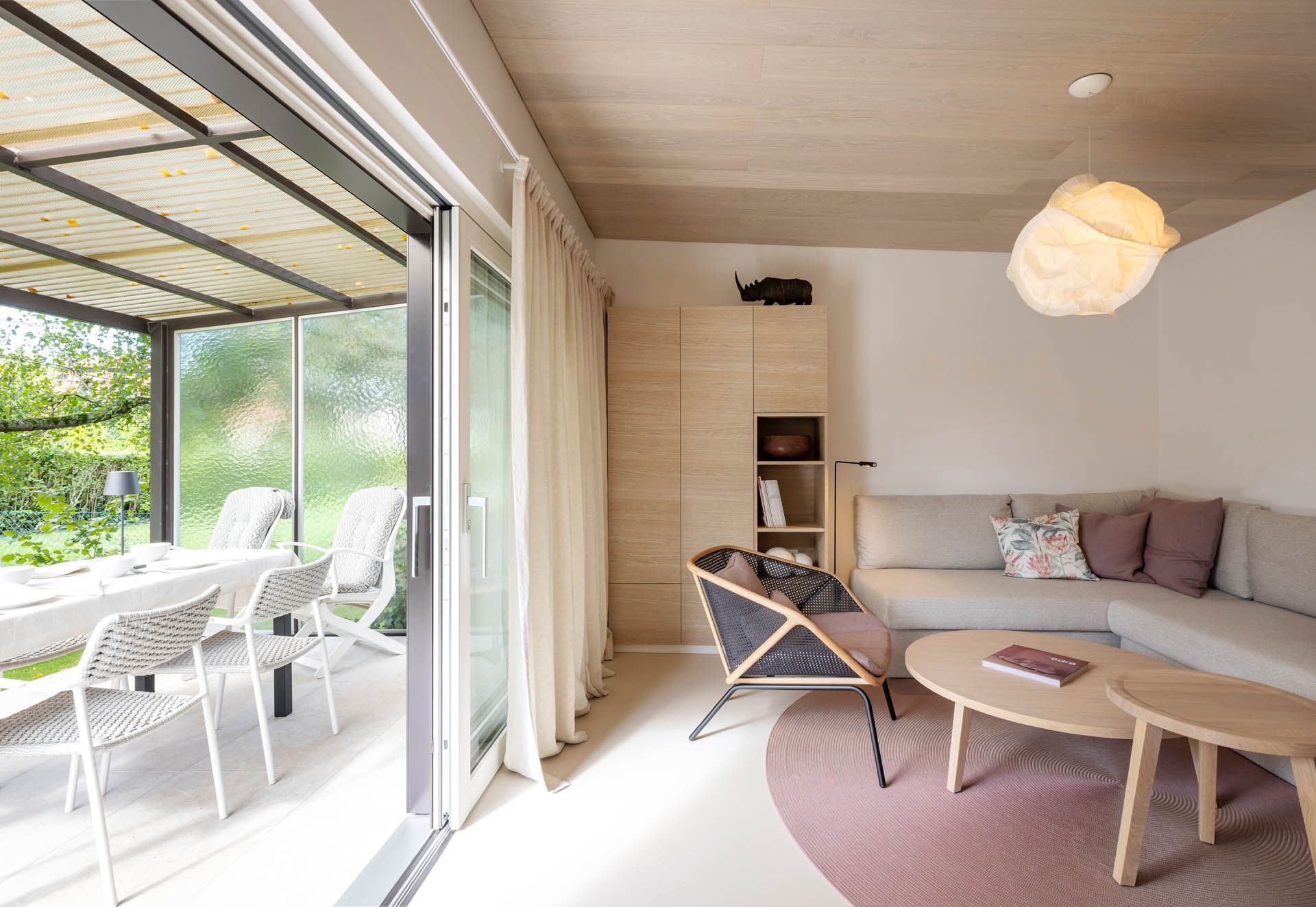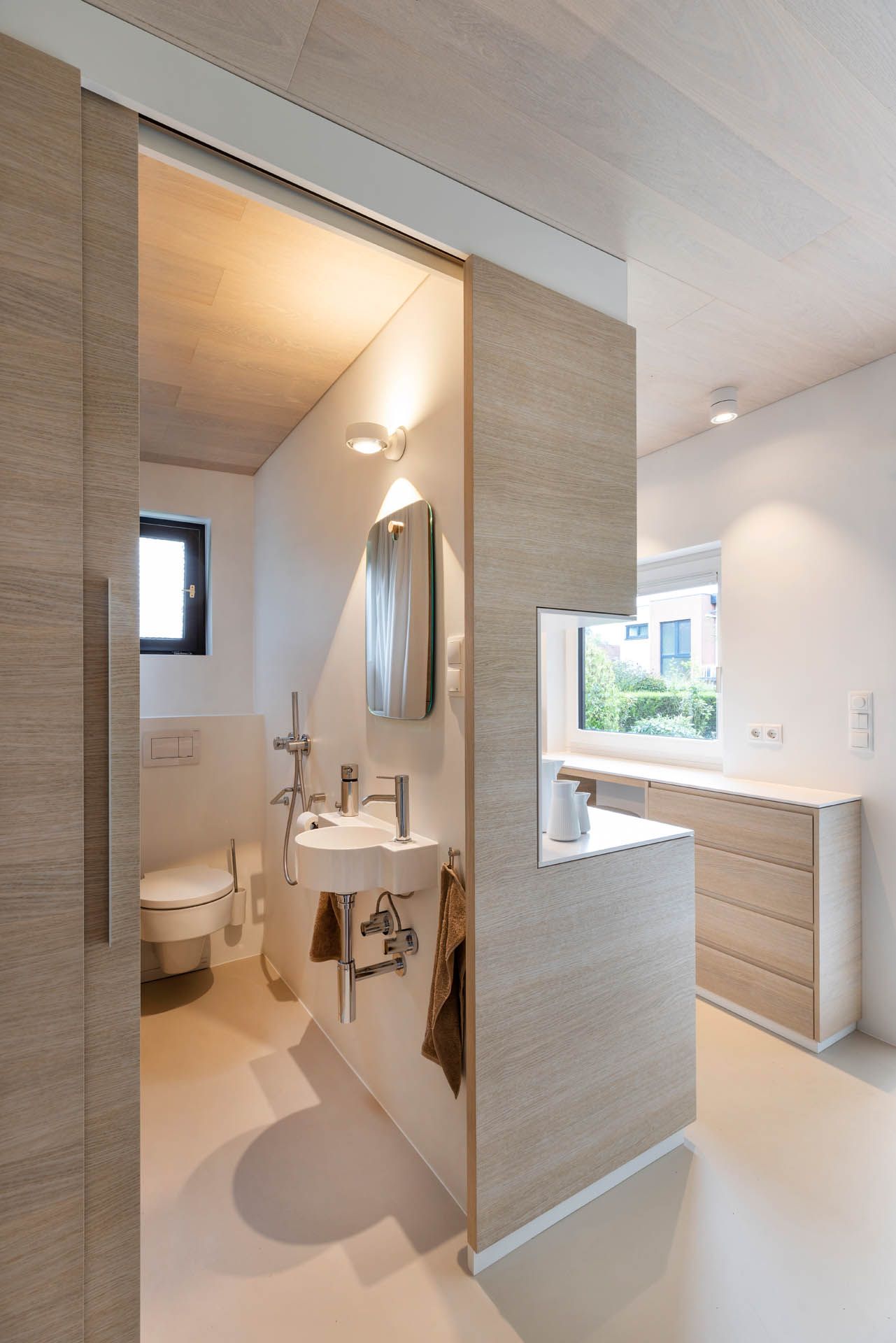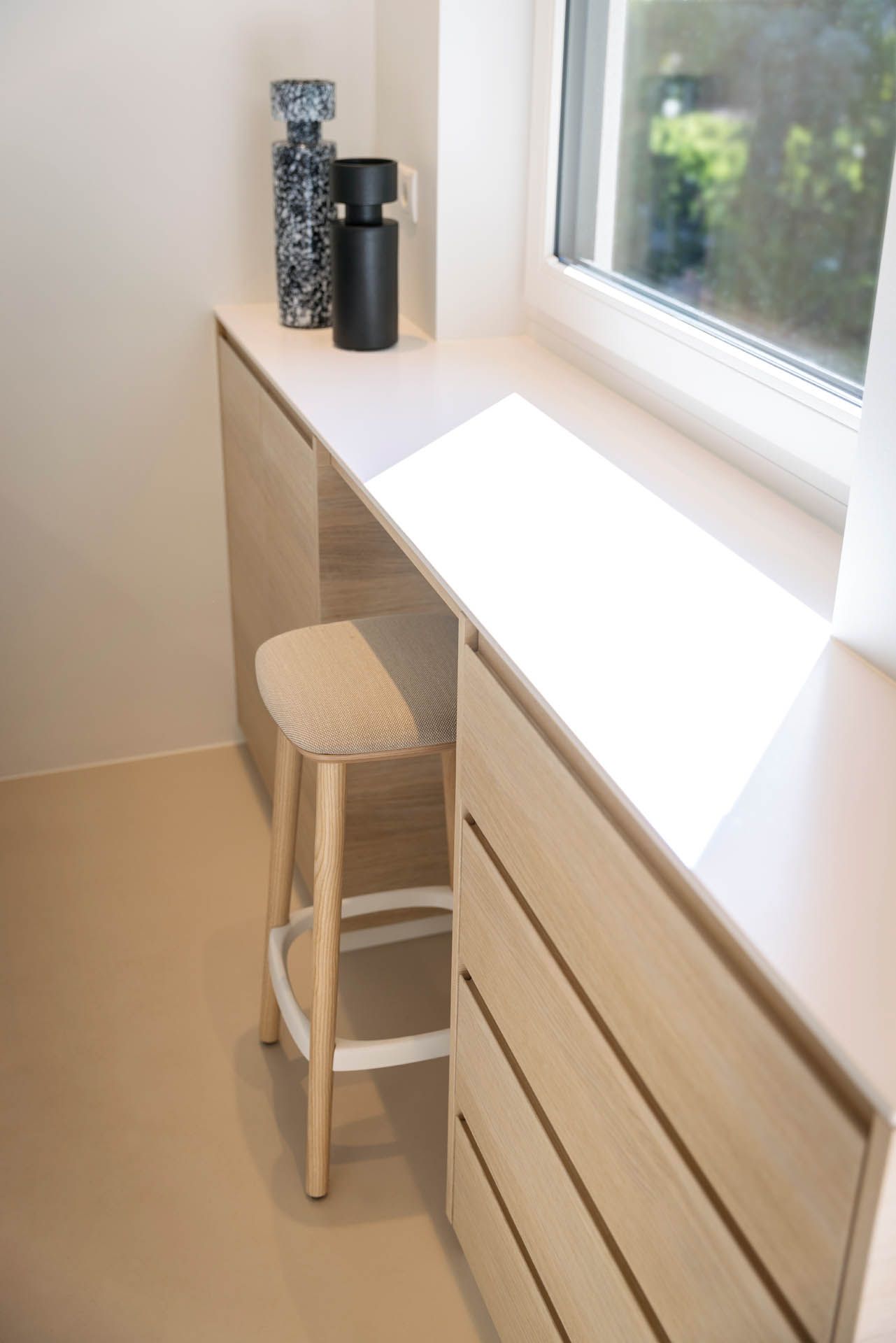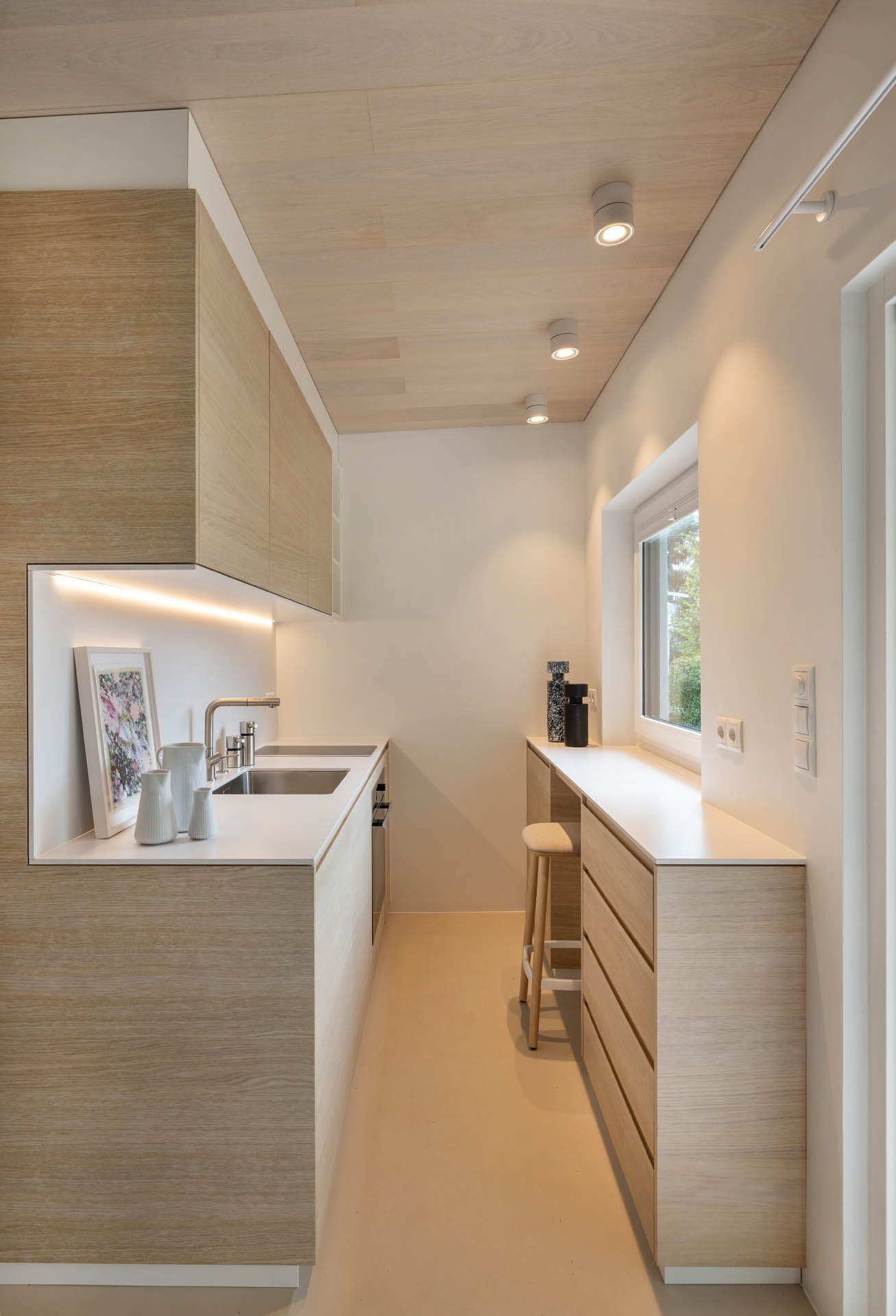 Deckenverkleidung mit Eichenboden belegt, Schrankfronten & Wandverkleidungen mit Eiche furniert passend zur Decke gebeizt und lackiert. Weiß matt lackierte Schleiflack-Oberflächen. Weiße Silestone-Oberflächen.
