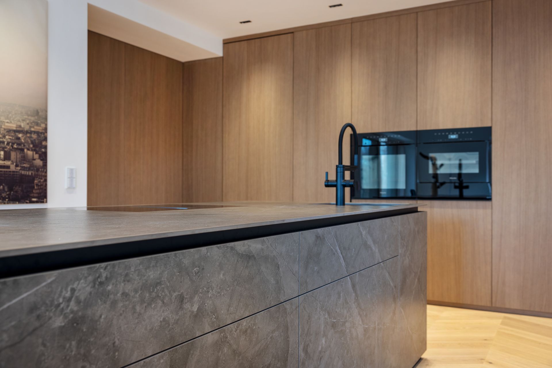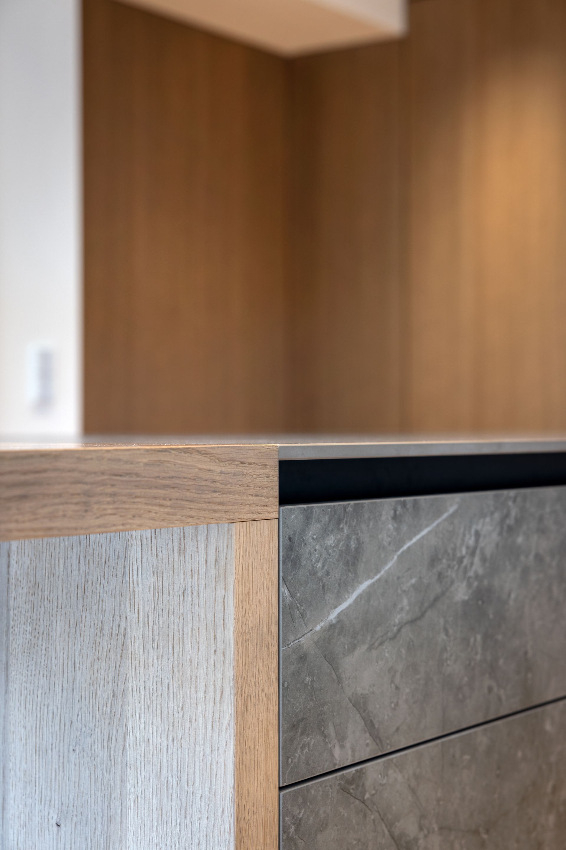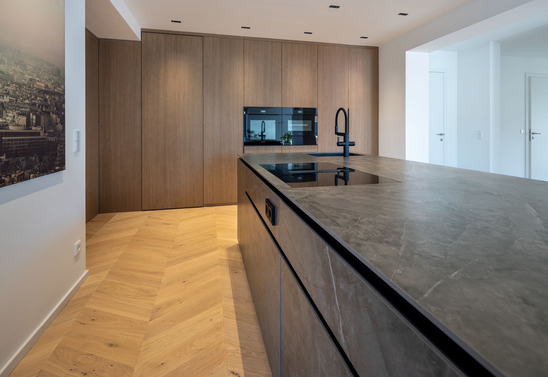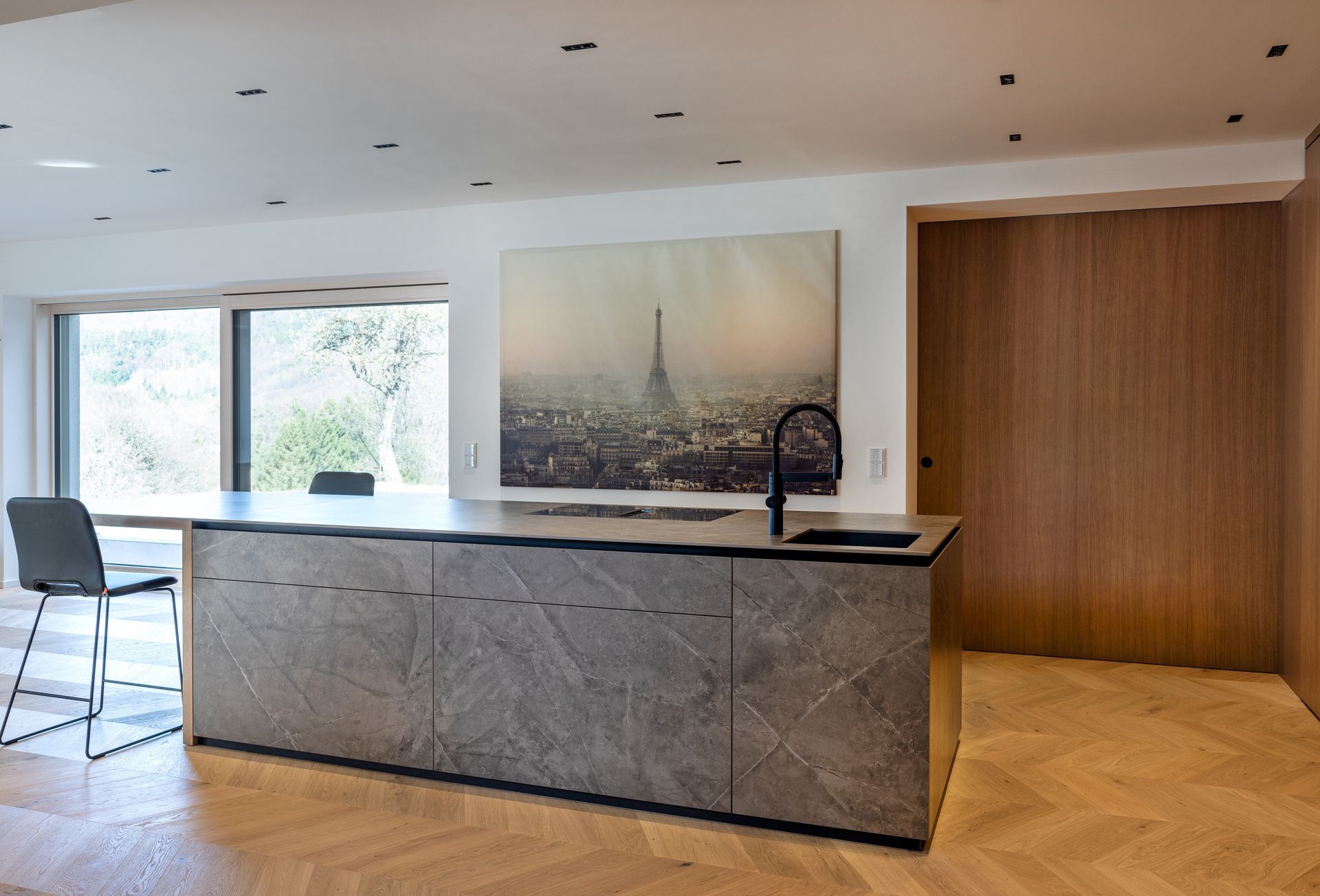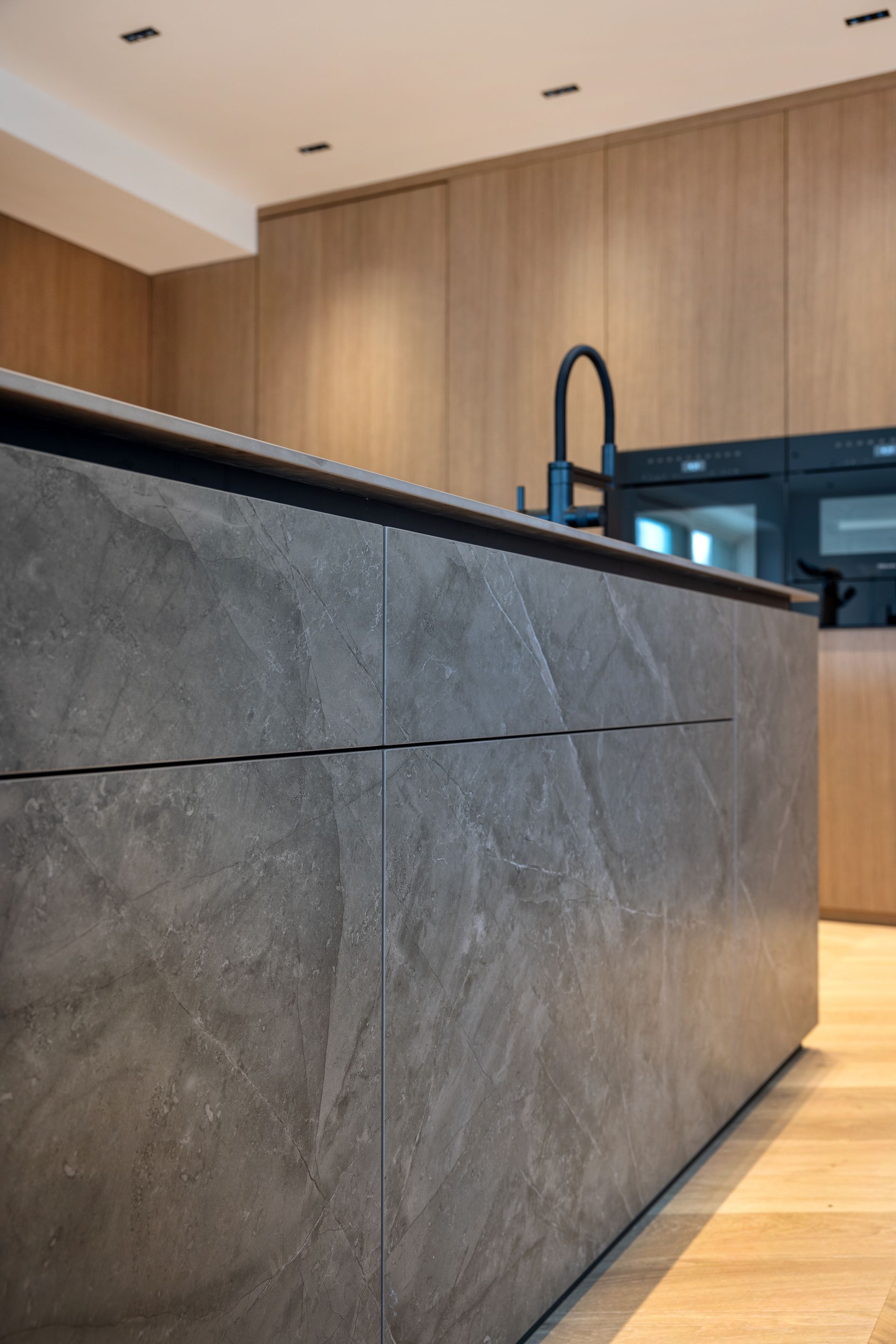 Die Küchenarbeitsplatte wurde mit einer Dekton -Keramik "Kira" mit Strukturverlauf ausgeführt.